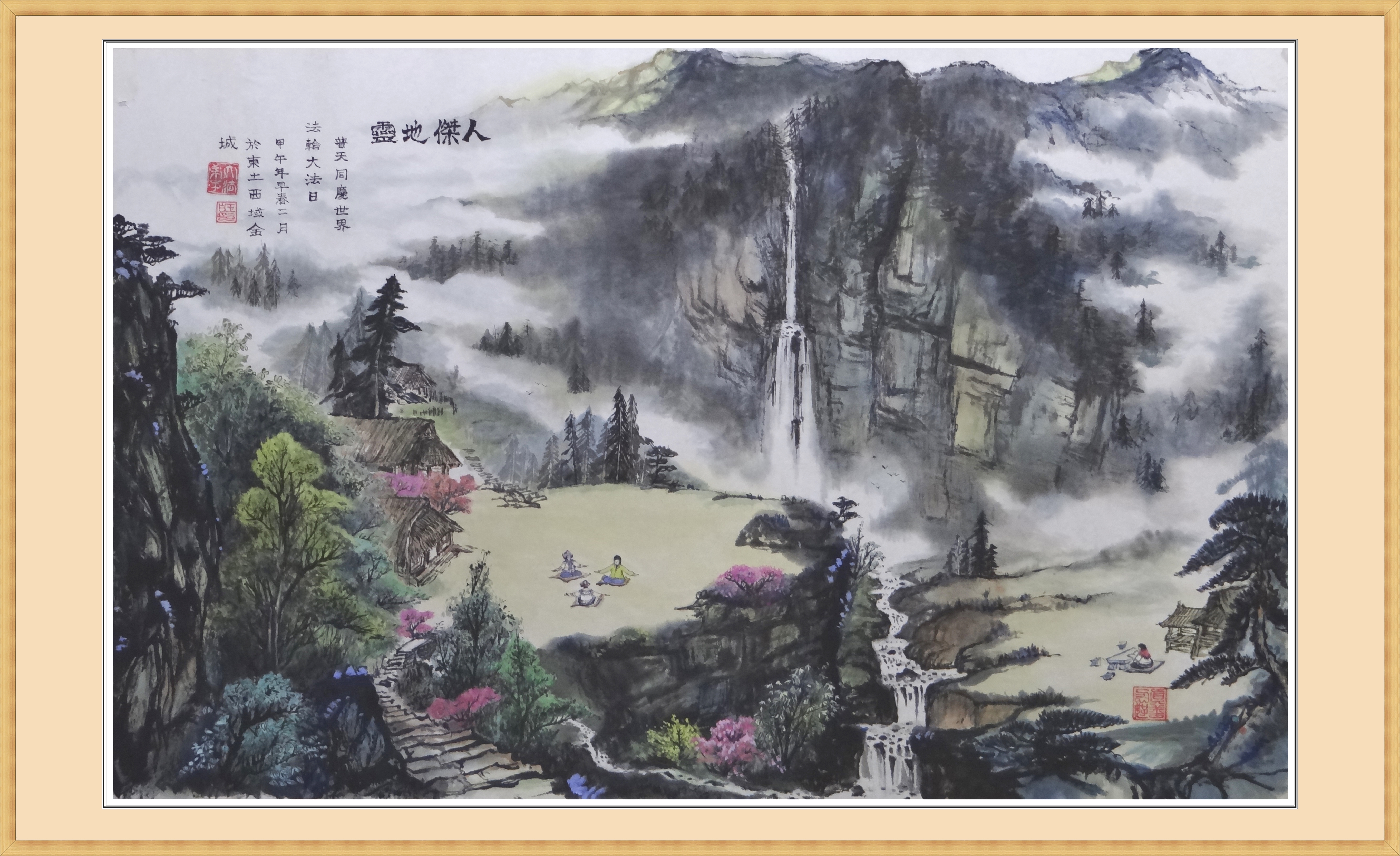 山水画表现了大山深处,有少数民族学法炼功的场面,画意想告诉人们法轮大法洪传人间,在远隔城市的大山深处也有大法弟子,赞美法轮大法在人间无处不在,不同的民族、不同的文化、不同的语言都能在大法中修炼提高。修炼法轮大法使得人心归正,道德回升,人心向善,也使得那里的山川变得更加美丽有名。