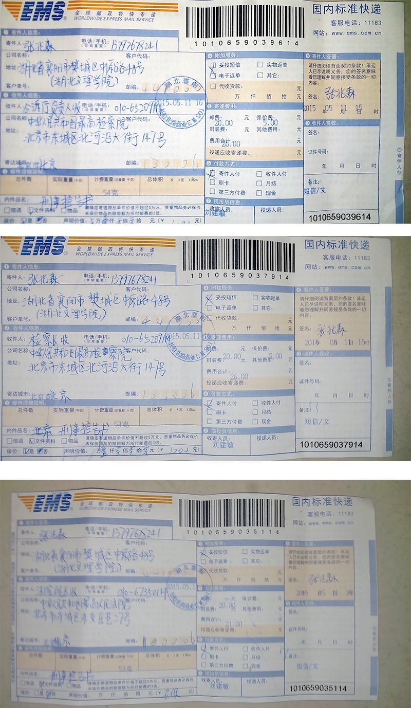 图为张兆森给最高人民检察院公诉厅、检察长和最高人民法院院长的三封快递邮件的照片。