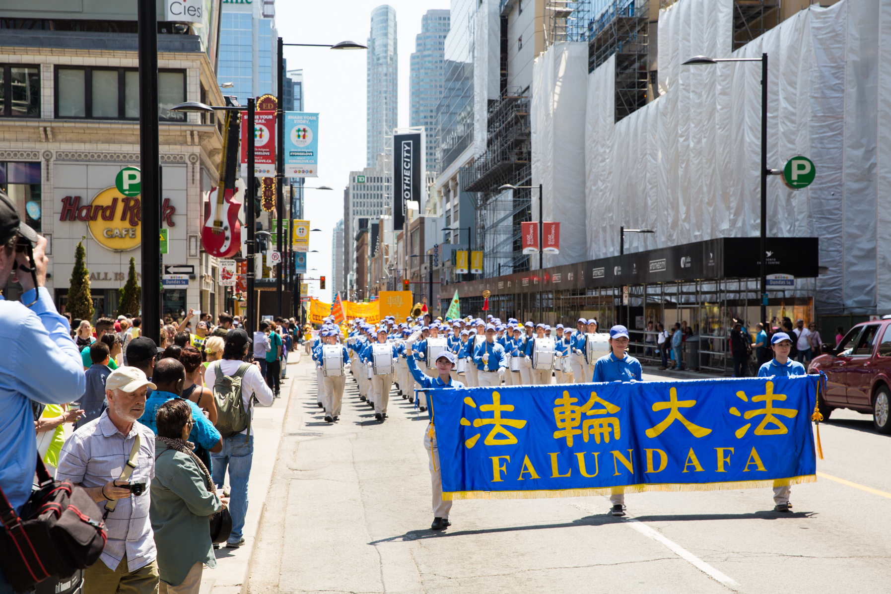 中午开始的大型游行,以雄壮的天国乐团开路,队伍从市政厅广场出发,在多伦多市中心和唐人街来回走了两圈,安省议员麦克拉伦(Jack Maclaren)和法轮功学员一起拉起了横幅走在游行队伍里。很多路人都拍下图片,接过传单,更多的人知道了真相。