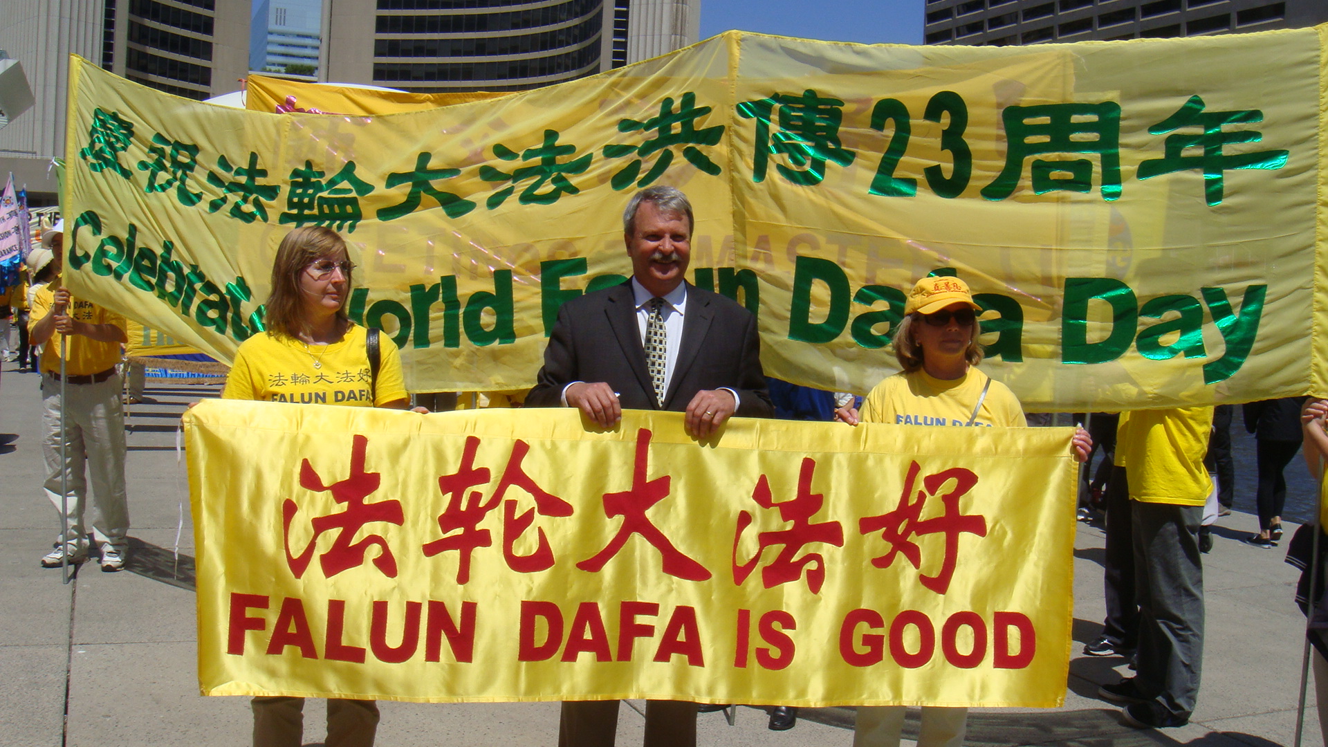 ![]() 政要们和法轮功学员一起欢呼:“法轮大法好!” |