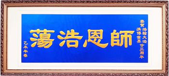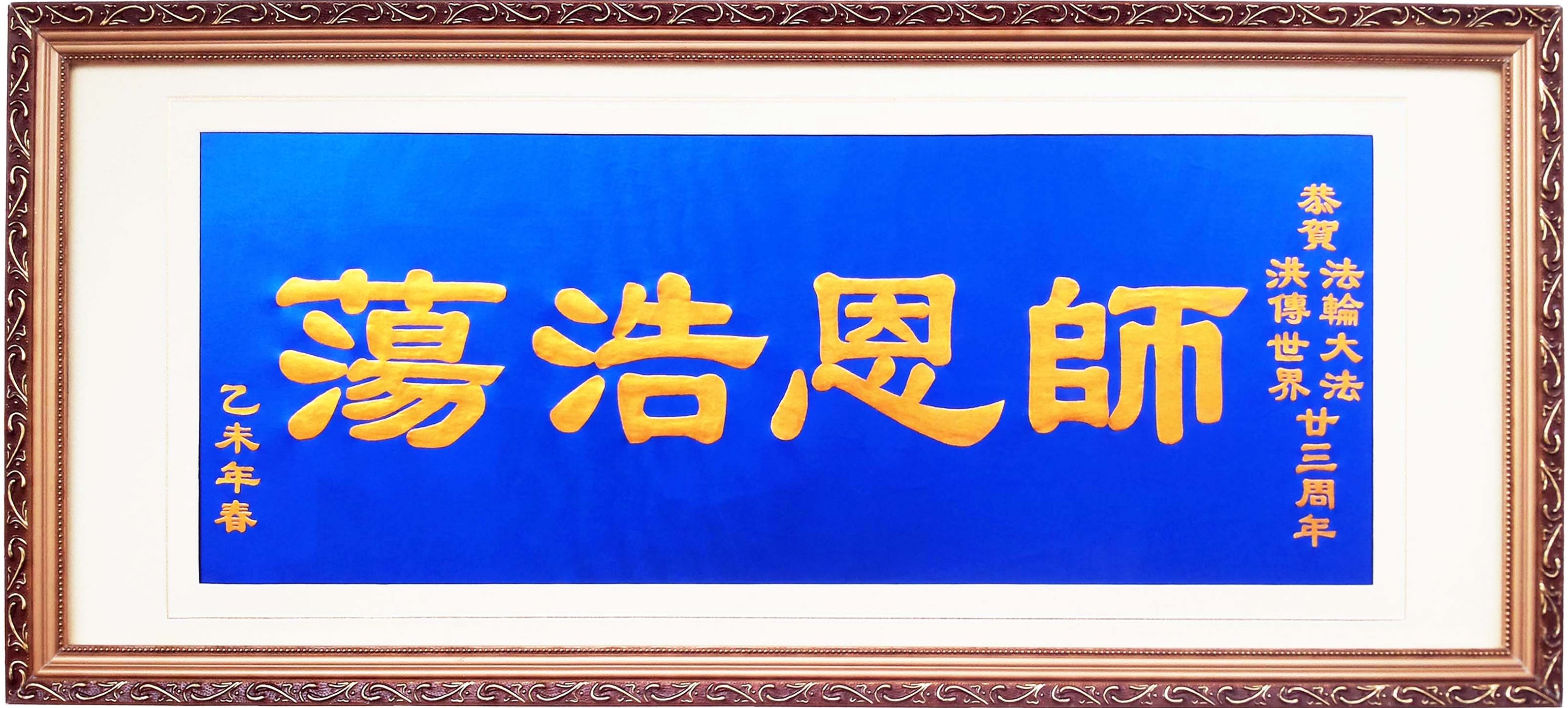 自从修炼了法轮大法,我们全家每时每刻都沐浴在师尊的浩荡洪恩之中,心中无比感激师父的救度再造之恩!为了恭祝二零一五年五月十三世界法轮大法日,我们全家怀着无比敬仰的心情,制作了这块匾额,表达我们对慈悲伟大的师尊的无比崇敬和无限感激!同时我们也叩拜敬上这块匾额,恭祝师尊生日快乐!