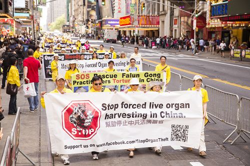 浩浩荡荡的法轮功游行队伍分成三个方阵:“法轮大法好”、“停止迫害法轮功”和“声援二亿中华儿女退出中共”。其中“停止迫害法轮功”的队伍包括四部分,分别是:伴随“普度”和“济世”音乐,身穿白衣手拿被迫害致死大法弟子花圈的队伍;身穿黄色炼功服的法轮功功法展示队伍;呼吁停止迫害和停止活摘器官等横幅图片;呼吁修炼自由的人群。