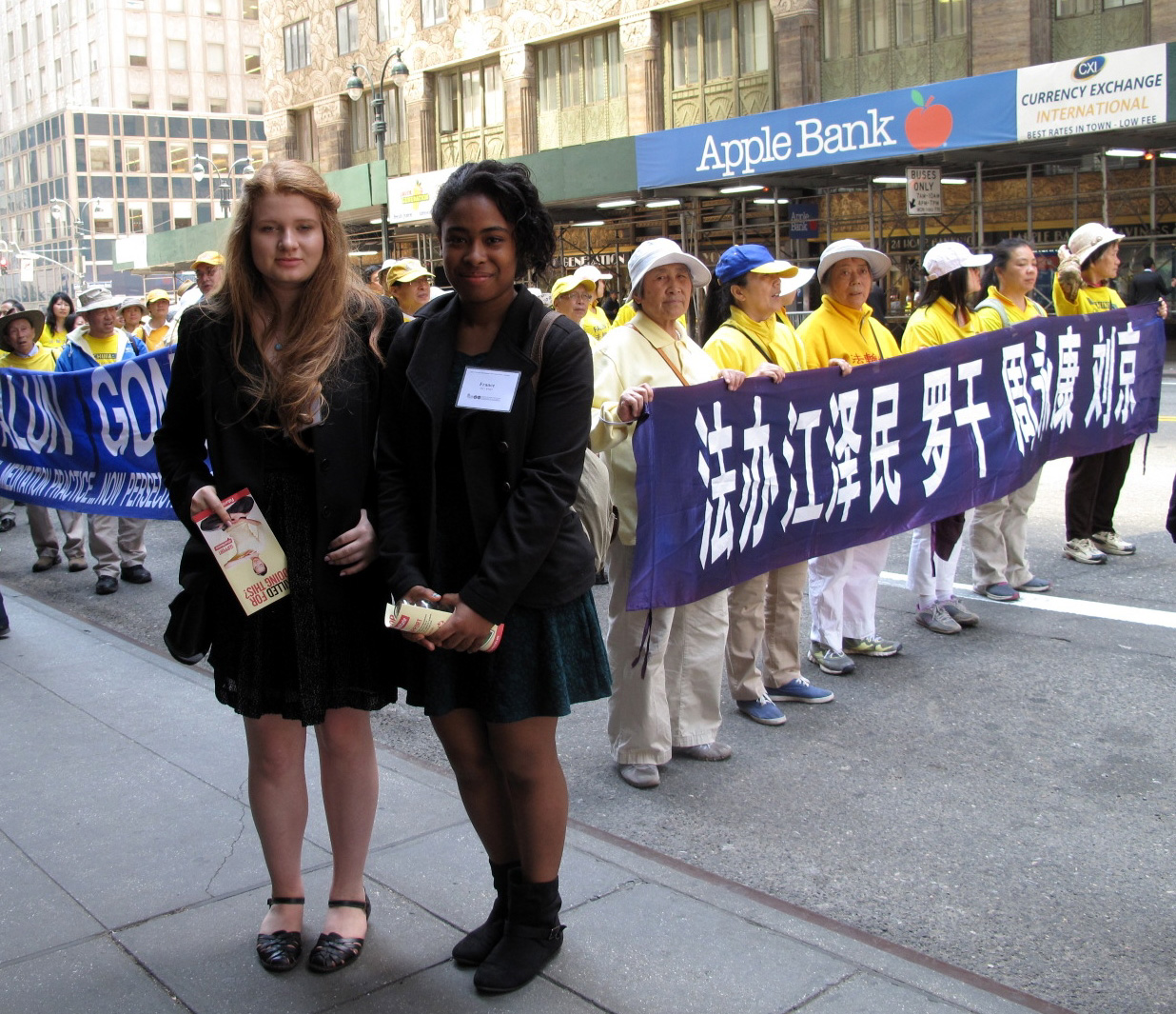游行队伍接近时代广场时,吸引了一群聚集在街道上穿制服的美国高中生,其中两个女孩乔莉和奥利弗(Jolly & Oliver)接过法轮功真相传单进一步了解真相。这群学生正在出席一个特殊的高中生会议,会议上学生们假设自己代表不同国家在联合国内开会,向联合国提出应该关注的世界重大问题。正在享受会议休息时间的学生们刚巧看到声势浩大的法轮功游行队伍在大街上走过。