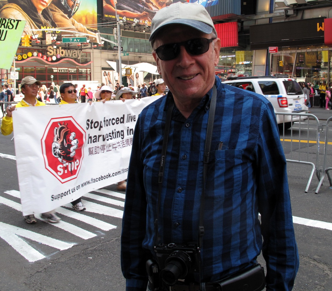 ![]() 退休律师哈维•罗森加特(Harvey Rosengart)正在认真观看法轮功学员在纽约举行的盛大游行 |