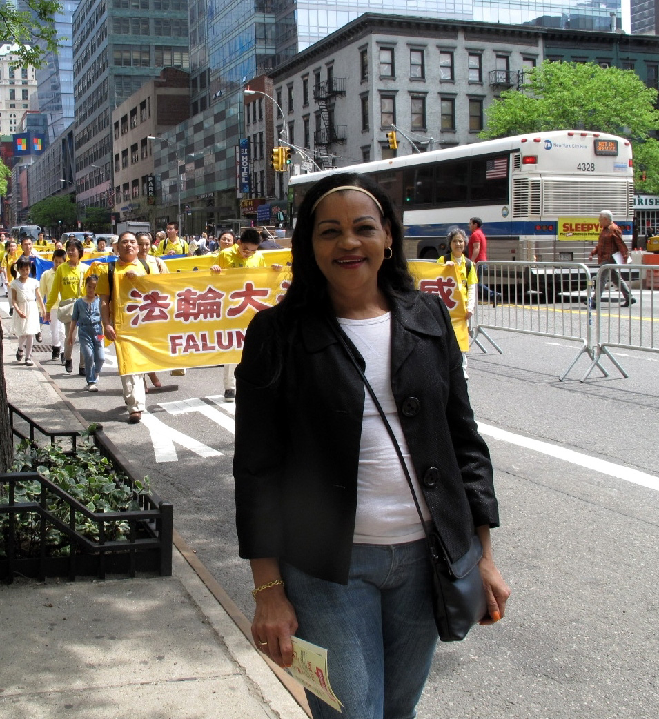 ![]() 纽约曼哈顿第二大道临街居民朱莉娅(Julia)站在法轮功学员盛大游行队伍前表示支持法轮功 |