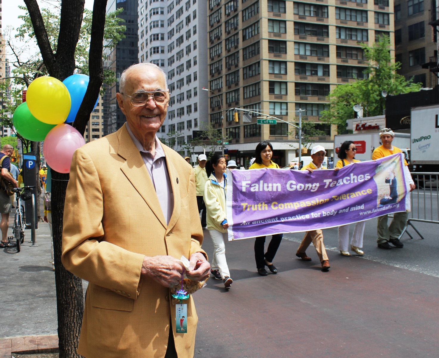 九十岁高龄的前外交官赛奥(Frank Sayo)先生从游行一开始就被深深吸引住了,法轮功学员送给他一朵小莲花,他非常高兴。美丽、壮观的游行队伍让他久久不舍离去。他告诉记者:“我是第一次听说法轮功,非常有意思。”