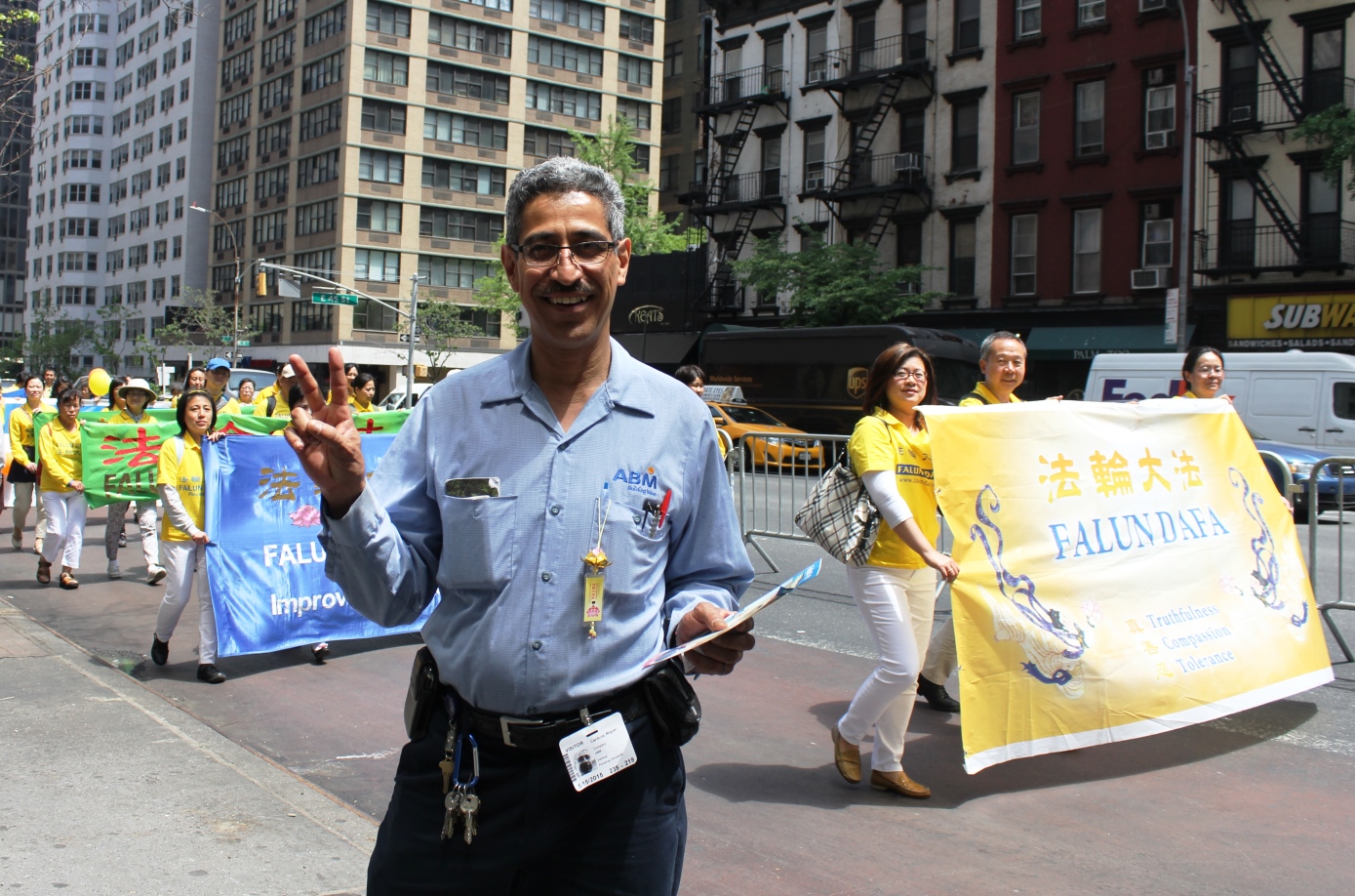 看到如此众多的法轮功学员精神奕奕地走过,他说:“这样美好的能量令人非常好奇。我很想了解更多。对于纽约市的民众来讲,能看到这样的游行,了解到这个世界发生了什么,也是非常有意义的。”