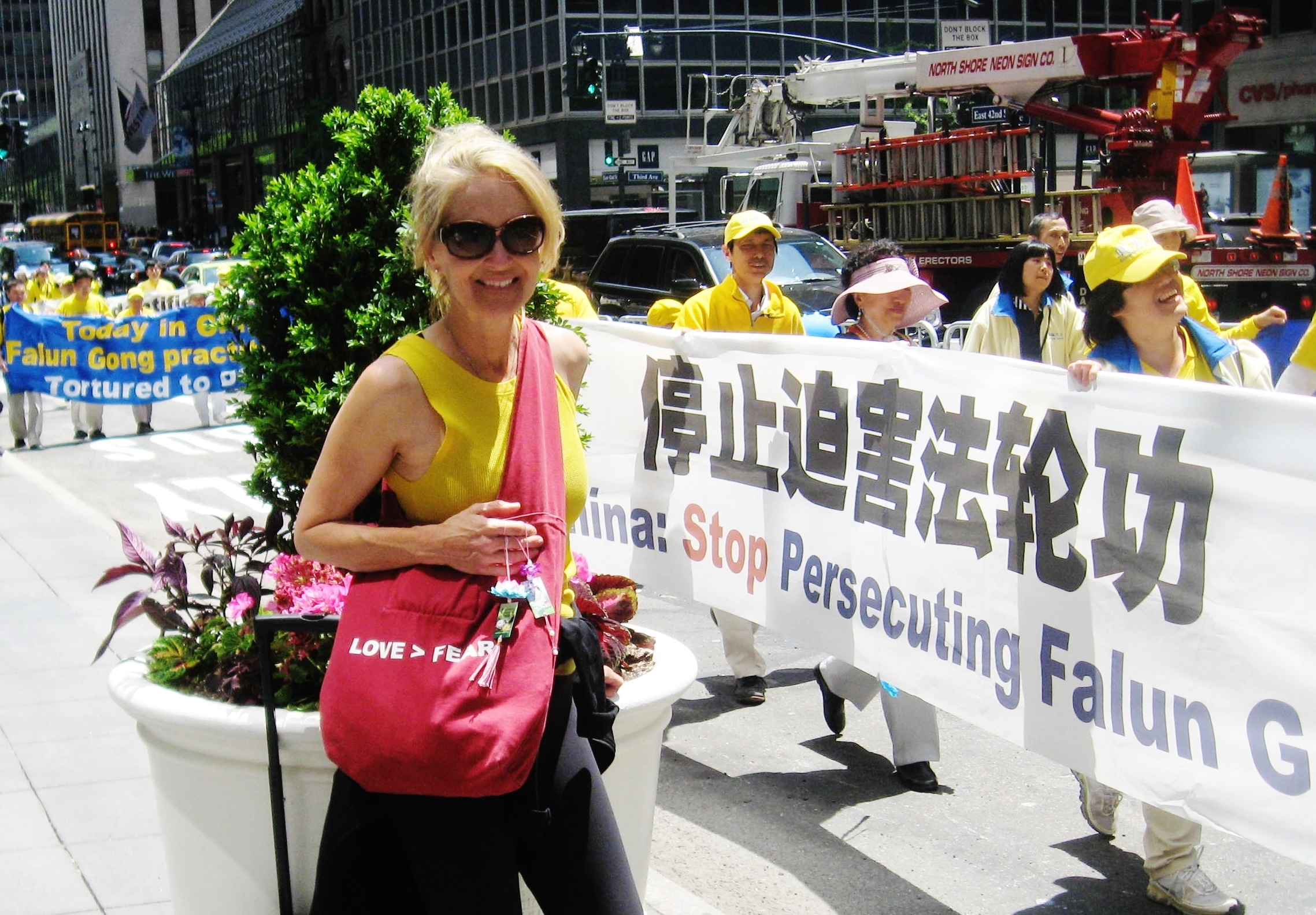 ![]() 玛丽莲·阿斯萍在法轮功曼哈顿大游行现场 |
