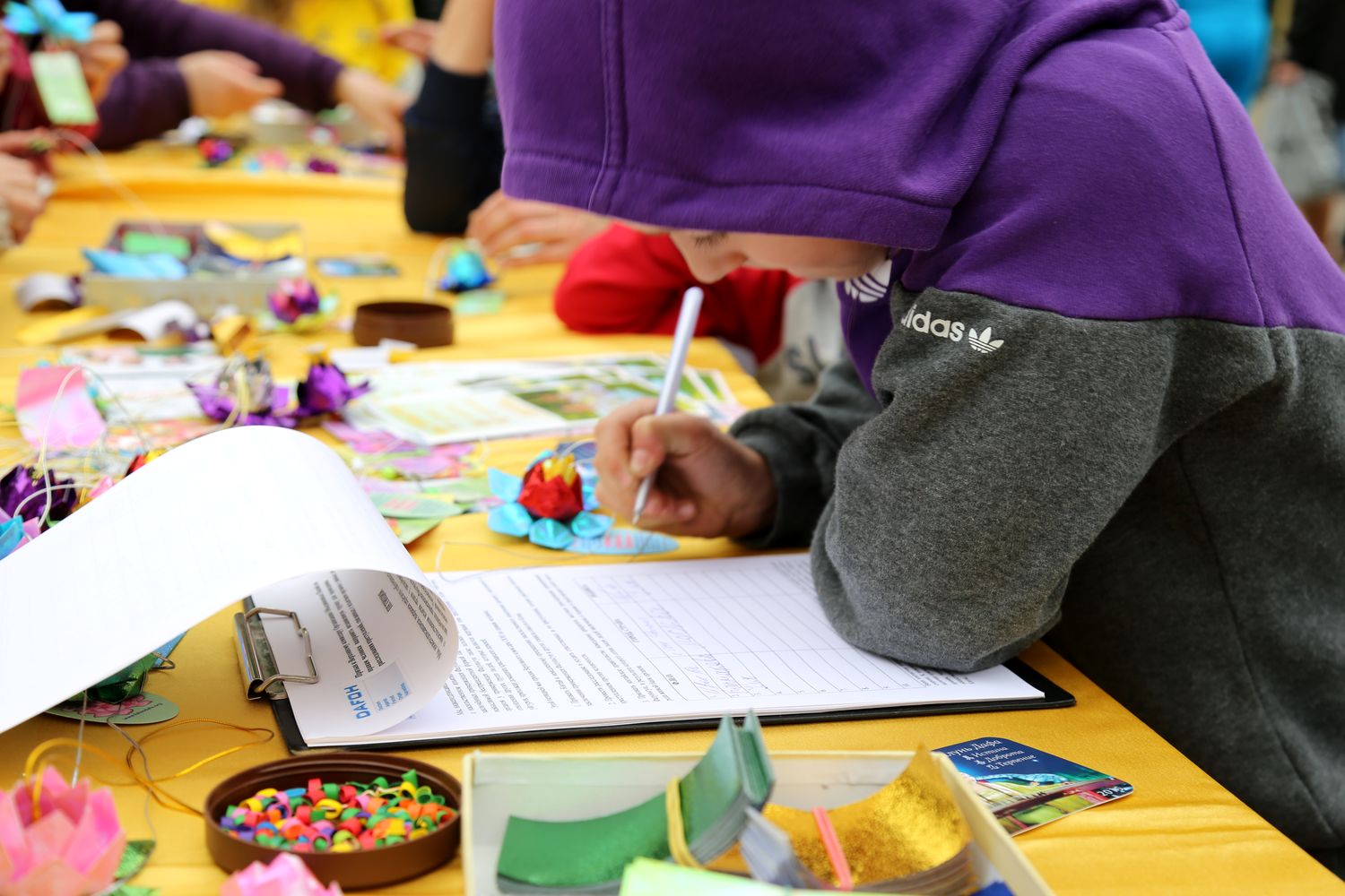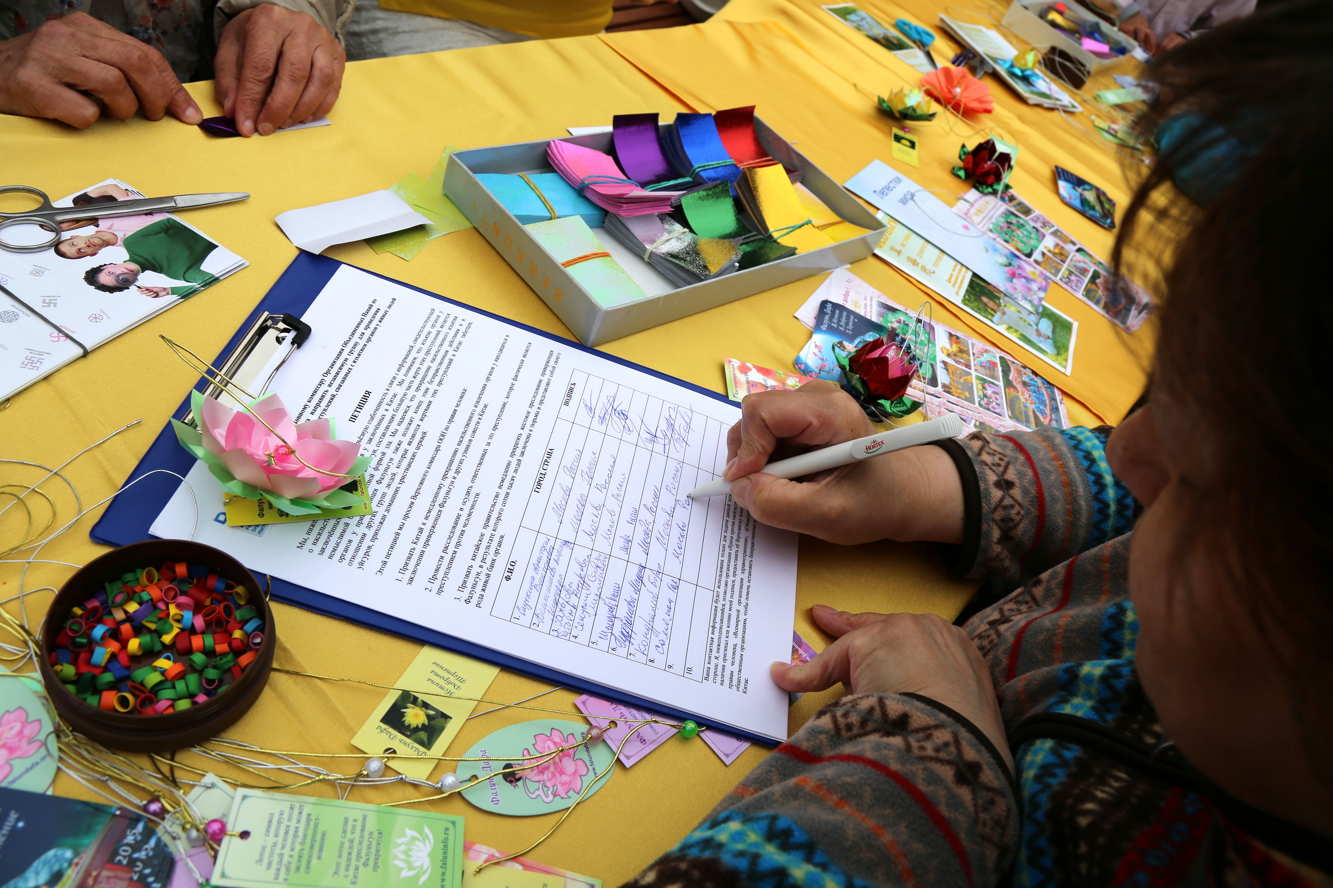 在舞台的旁边设有桌椅,许多孩子和大人纷纷前来学习如何制作带有“真善忍,法轮大法好”字样的纸莲花。活动过程中,很多人在了解了法轮功学员在中国受到的迫害后,纷纷签名要求制止迫害。