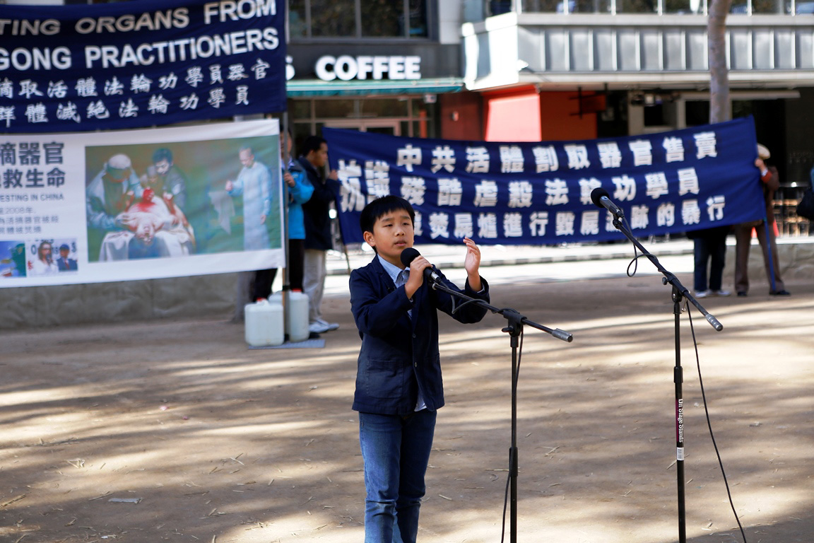 大法小弟子安心(Aaron)在集会期间演唱了《高贵的灵魂在风中》等数首歌曲,表达了在虐杀面前,法轮功学员坚守信仰,揭露真相反迫害,把善的力量给予了世人。小学员清纯的歌声引来阵阵喝彩,也感动了很多人。