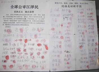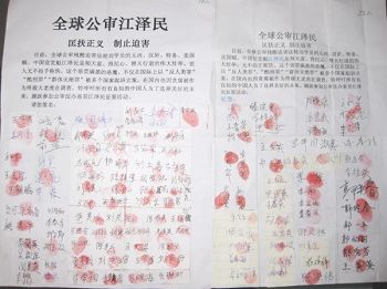 还有一个中年男子,签名按手印以后,说:“江泽民早该死了,一定要在人间审判他以后再死。”