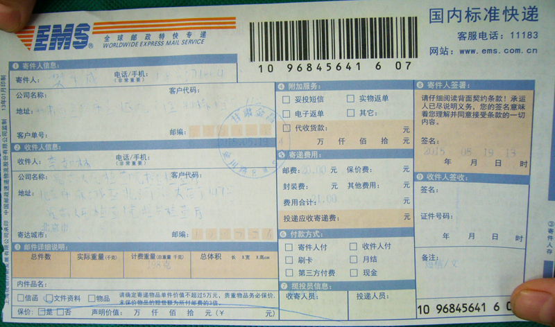 ![]() 甘肃金昌樊永成、雷占香邮递诉状的回执 |