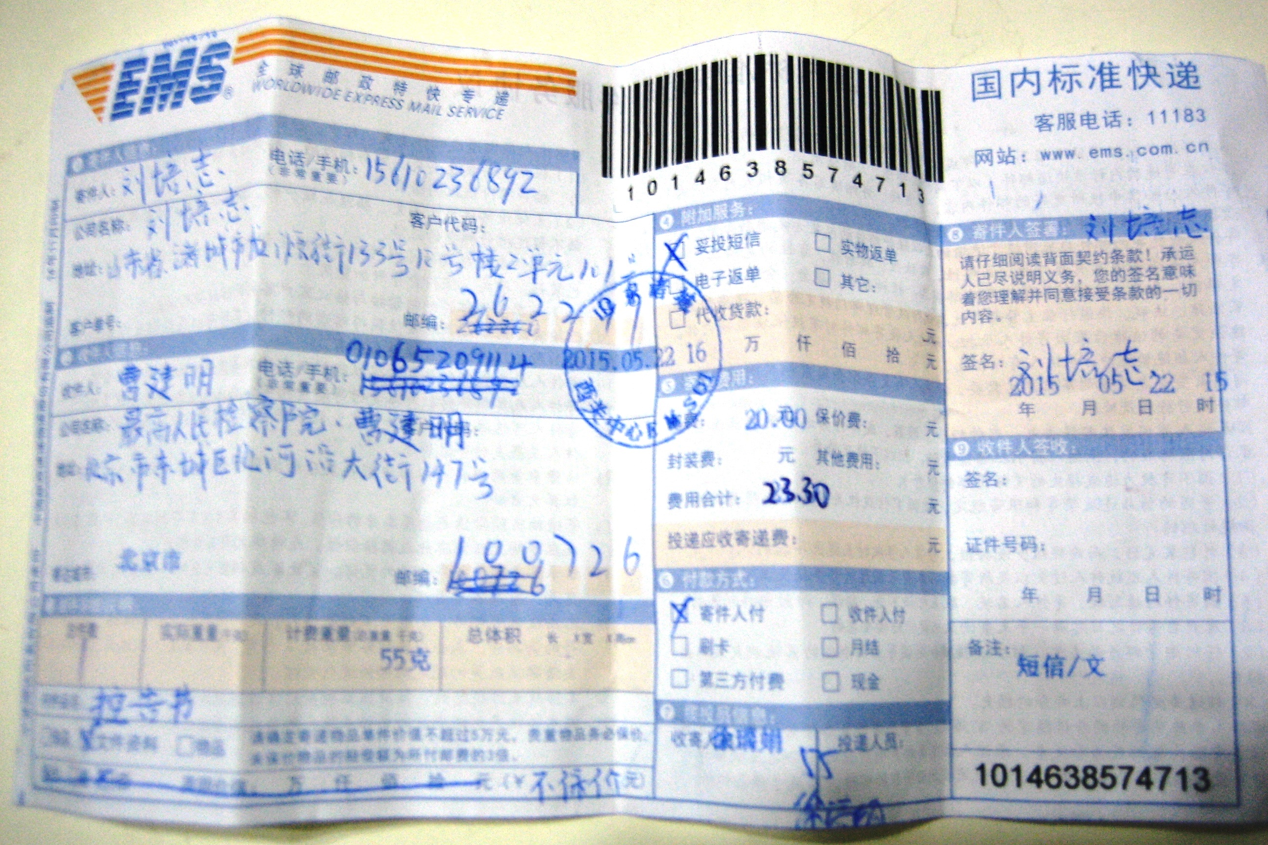 ![]() 刘培志投寄诉状的邮政快递回执 |