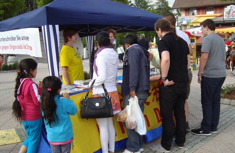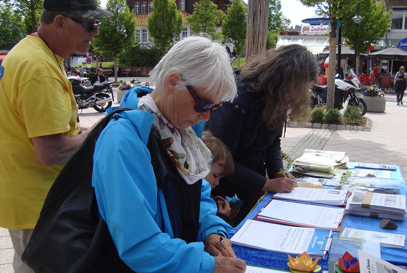 缇缇湖(Titisee)是德国著名景点,常年吸引世界游客,也是大陆旅游团经常光顾的景点。围绕信息台,摆满了真相展板,引来很多游客。有几位台湾、南韩华人,主动到信息台做反迫害征签。