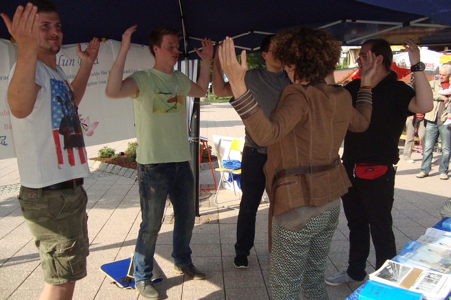 四个德国小伙在信息台前看展板,认真听了学员讲的法轮功真相后,表示想炼法轮功。于是,学员当场教他们功法。他们做得非常认真,胳膊举酸了,也在坚持。有人说有强大的能量正包裹着自己,都惊叹法轮功太神奇了!