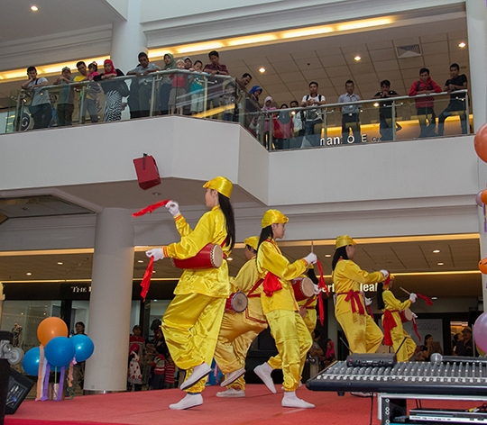 五月十日,星期天,学员们征得梅格商城的同意,到这里庆祝世界法轮大法日。这是个大型商城,学员们先是在台上演示功法,接着是腰鼓队表演,舞台下的学员们则向观众散发传单和纸莲花,向商城的顾客们介绍法轮大法的美好以及发生在中国的迫害真相。