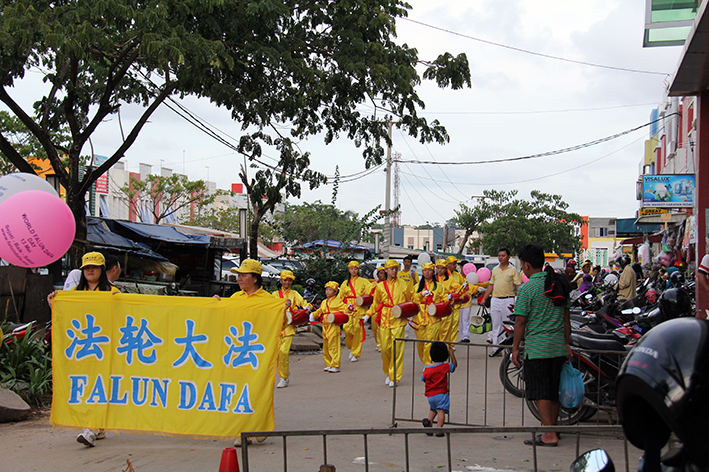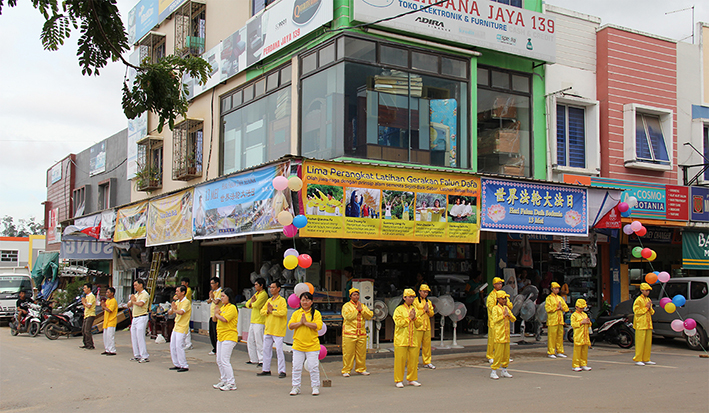 五月的第四个星期天,巴淡岛当地的法轮大法学员在波塔尼阿市场的一家电器和家具商店门前举行庆祝活动,商店的老板已经开始学炼法轮功。许多市场里的顾客停下脚步,观看功法演示和腰鼓队表演。由于商店的位置极佳,学员们拥有很好的机会向民众介绍功法和讲清真相。