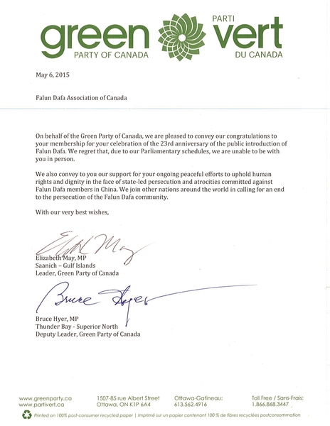 联邦绿党领袖、国会议员伊丽莎白•梅(Elizabeth May)和联邦绿党副领袖、国会议员布鲁斯•海耶(Bruce Hyer)联名代表加拿大绿党发出贺信,祝贺法轮大法传世二十三周年。贺信中说:“谨代表加拿大绿党,我们非常高兴能向参加法轮大法洪传二十三周年庆祝活动的人们表达我们的祝贺。”