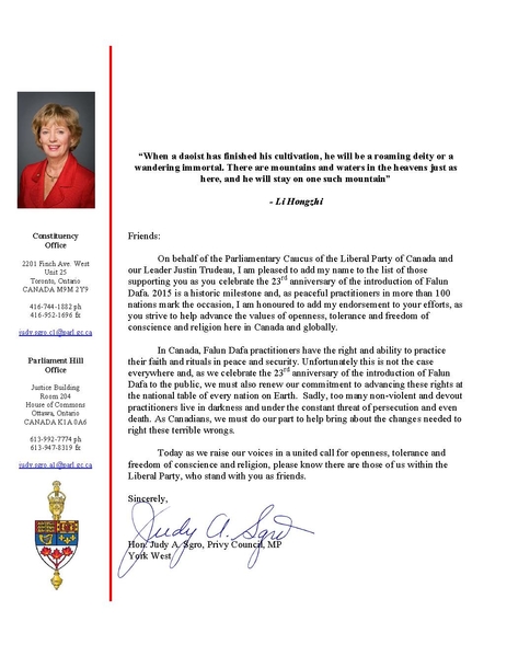 前自由党联邦部长,资深国会议员朱迪•思格若(Judy Sgro)已连续多年为法轮大法日发出贺信。