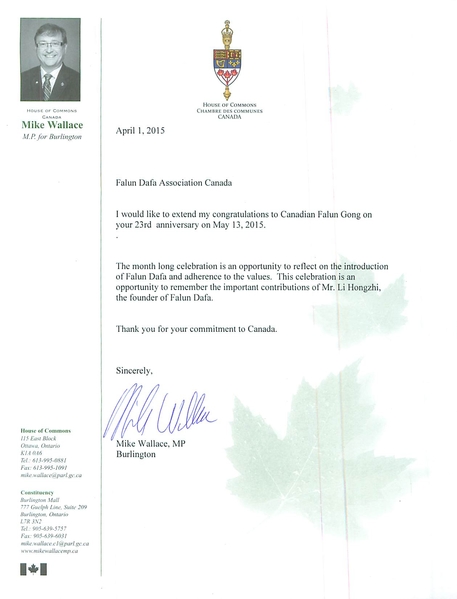 加拿大国会正义与人权委员会主席,国会议员迈克•华莱士(Mike Wallace)在贺信中就法轮大法日向加拿大的法轮大法社区献上祝贺。