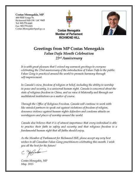 贺信中说:“在加拿大,法轮大法的修炼者有权利在和平安全的氛围中追寻他们的信仰。不幸的是,并非世界上的每一个角落都享有同样的信仰自由。当我们庆贺法轮大法传世二十三周年之际,我们必须再次提醒自己,我们有义务帮助世界上每一个国家的民众获得这样的权利。让人伤心的是,太多虔诚的,非暴力的修炼人依然生活在黑暗之中,随时面临迫害,甚至是失去生命的危险。作为加拿大人,我们有责任尽我们所能,推动改变,以结束这场极其不公正的迫害。”