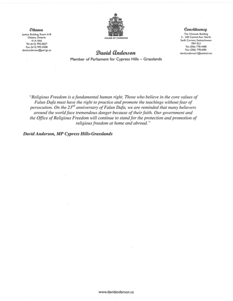 国会议员大卫•安卓森(David Anderson)在贺信中说:“宗教自由是一项基本人权。那些坚信法轮大法基本价值的人们必须有权利在无需畏惧迫害的情况下修炼和弘扬功法。”