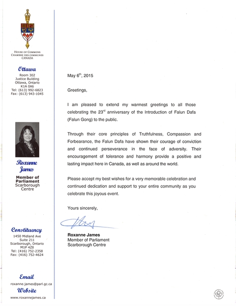 国会议员若克斯安妮•詹姆斯(Roxanne James)在贺信中说:“我非常高兴向参加法轮大法洪传二十三周年庆典的所有人表达最衷心的祝贺!”
