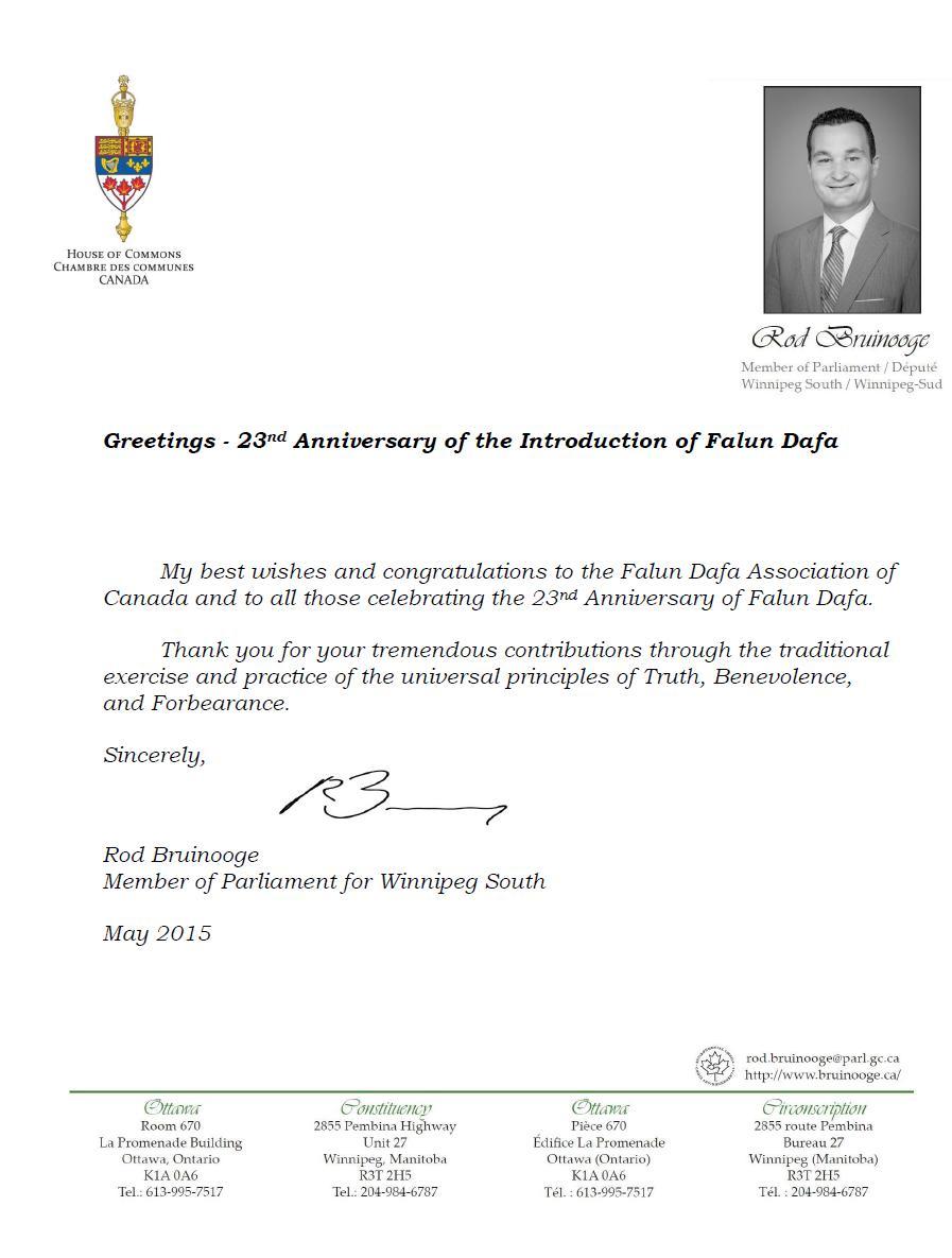 温尼伯南区国会议员洛德•布鲁恩格(Rod Bruinooge)发来贺信,祝贺法轮大法洪传二十三周年。他表示:“我向加拿大法轮大法学会和所有庆祝法轮大法洪传二十三周年的人们致以衷心的祝贺和最美好的祝福。”“感谢你们通过修炼‘真、善、忍’普世原则而做出的巨大贡献。”