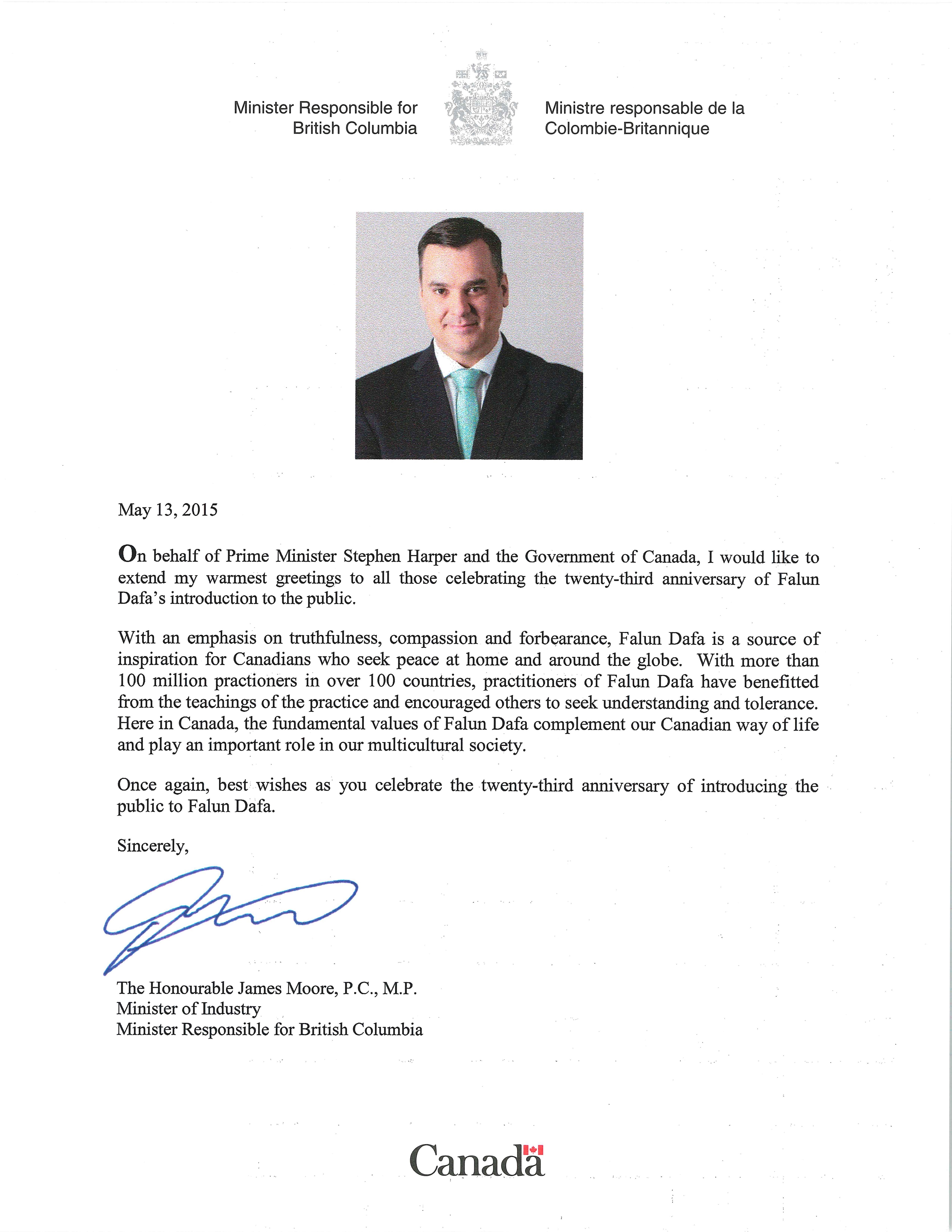 加拿大工业部部长詹姆斯•穆尔(James Moore)在贺信中代表哈珀总理和加拿大政府,向庆祝法轮大法传世二十三周年的人们致以最热忱的问候。