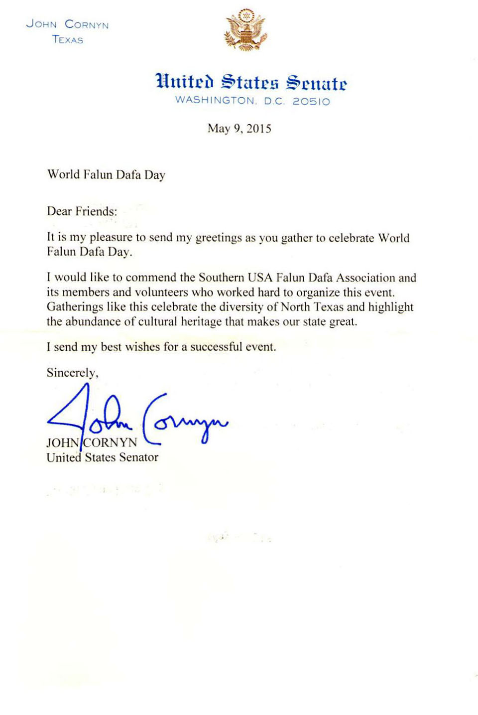美国参议员John Cornyn在其贺信中赞扬美南法轮大法学会组织的这个活动增加了北德州多样性的文化。