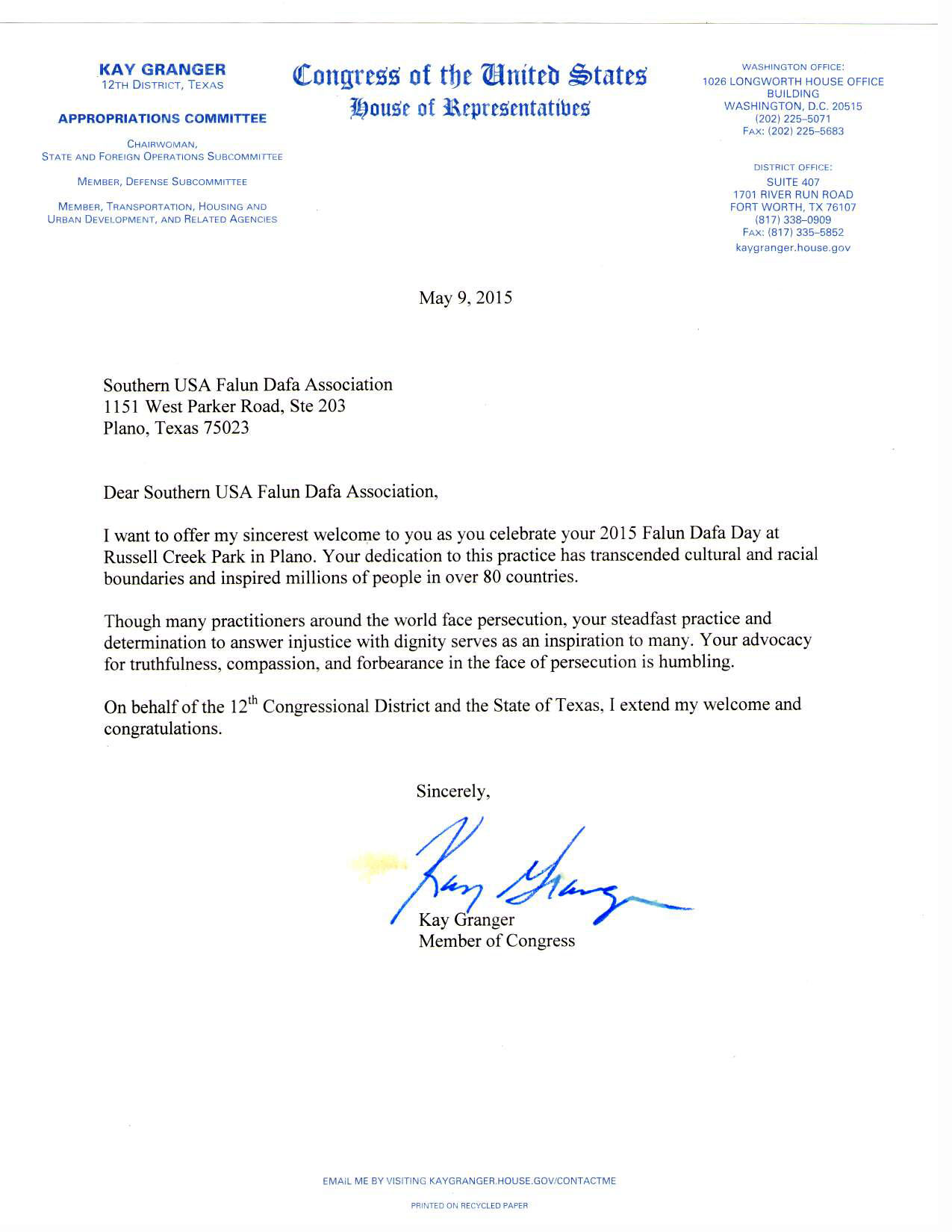 美国国会德州第十二选区众议员Kay Granger称赞法轮功学员面对中共迫害时表现出的勇气,她在信中说:“你们的坚定和面对不公表现出的高尚行为激励了很多人。面对迫害,你们仍倡导 ‘真、善、忍’,震撼人心。”