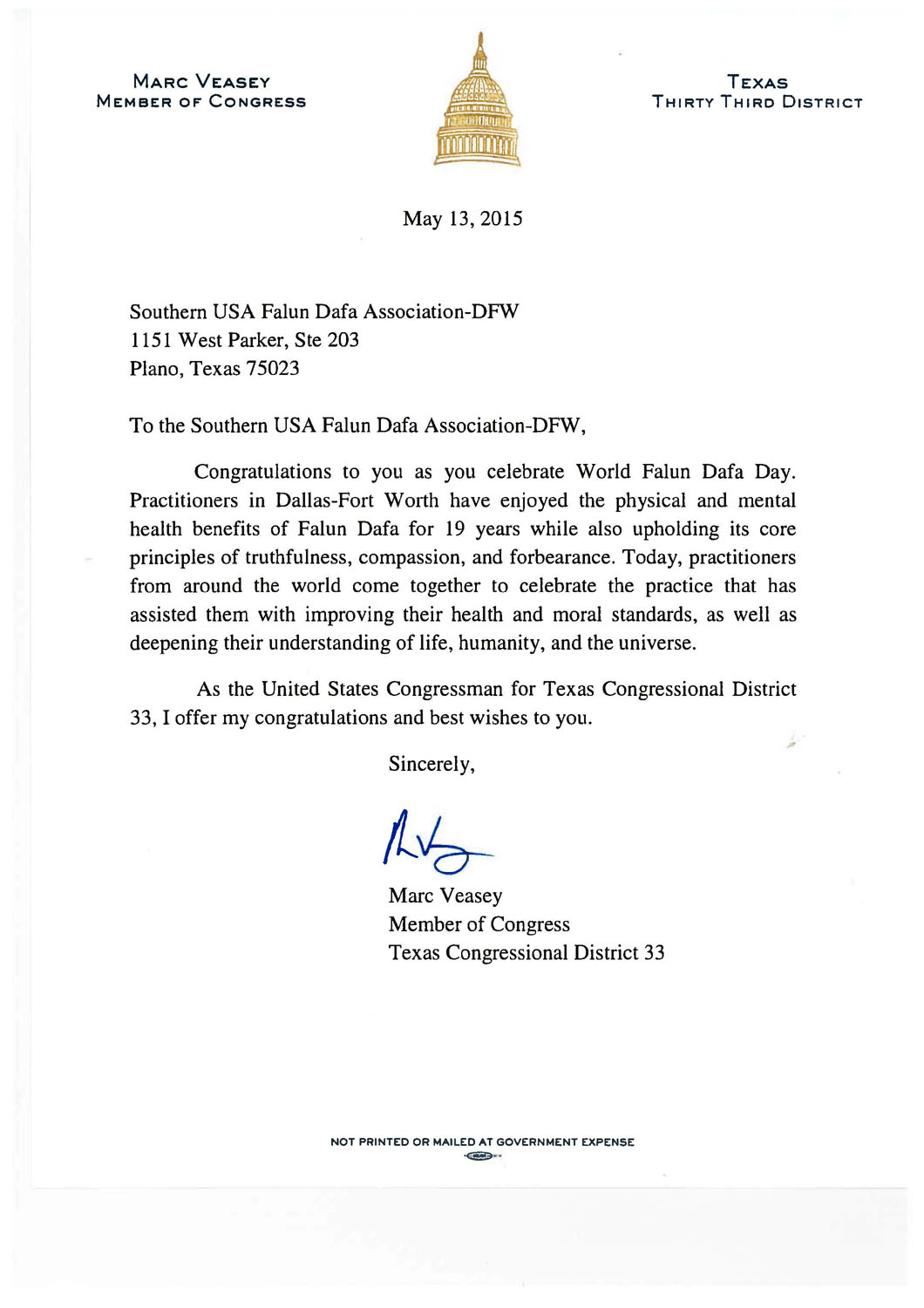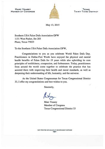 美国国会众议员Marc Veasey为此次活动发来的贺信,这位德州第三十三选区议员在信中赞扬法轮大法的“真、善、忍”原则给人们带来了身心的健康,她非常自豪自己能对这个活动给予祝贺。