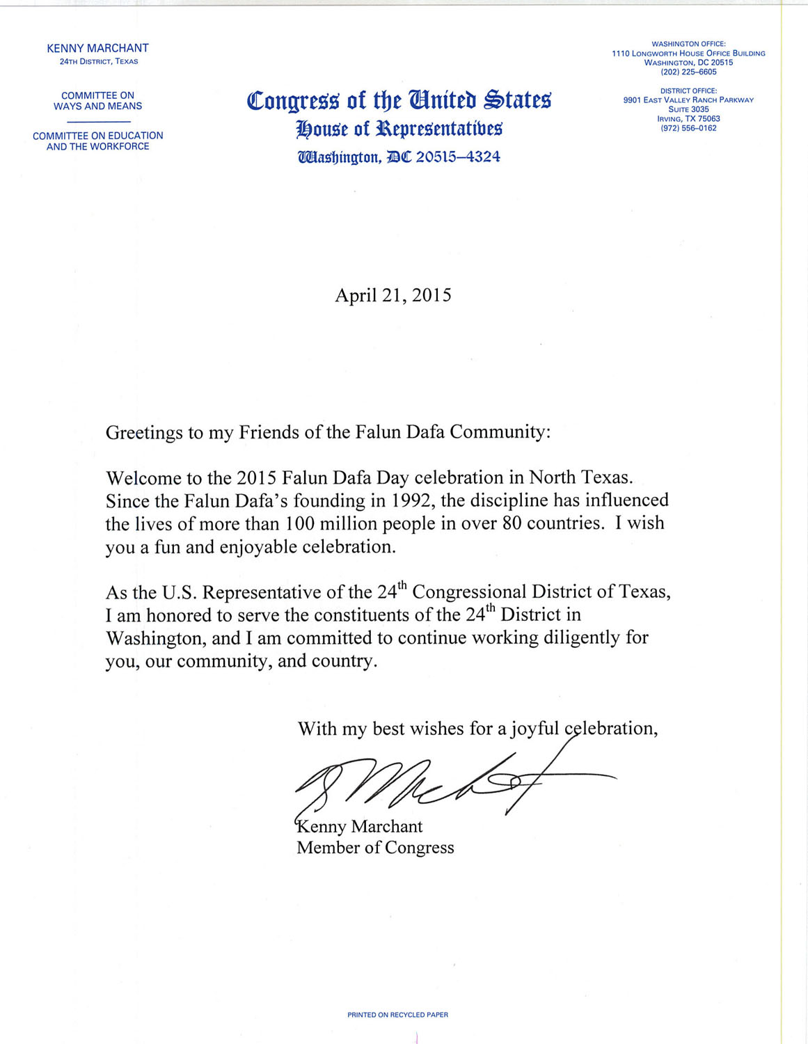 美国国会众议员Kenny Marchant称赞法轮大法改善了上亿人的生活,预祝庆祝活动成功。