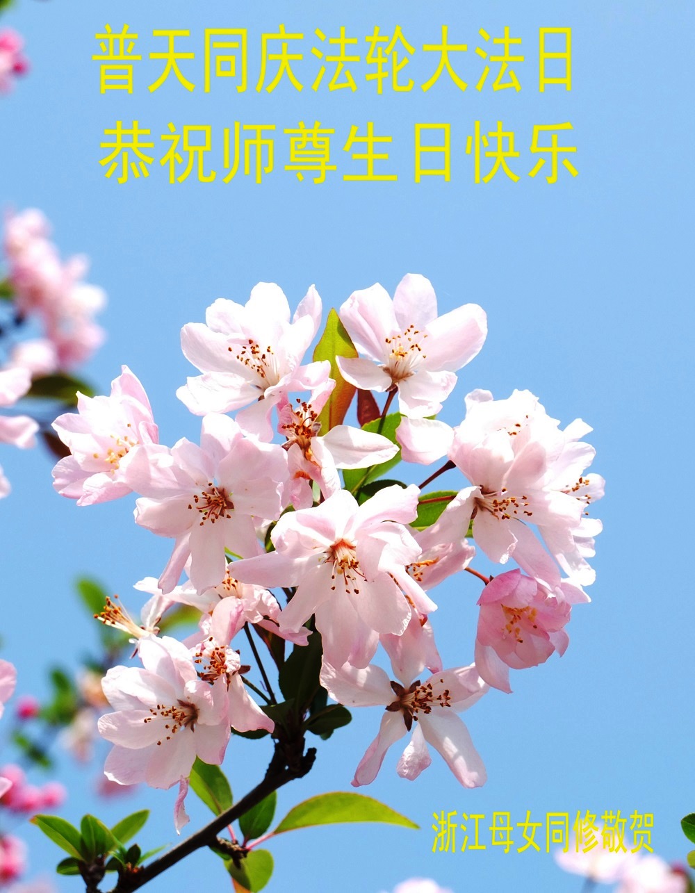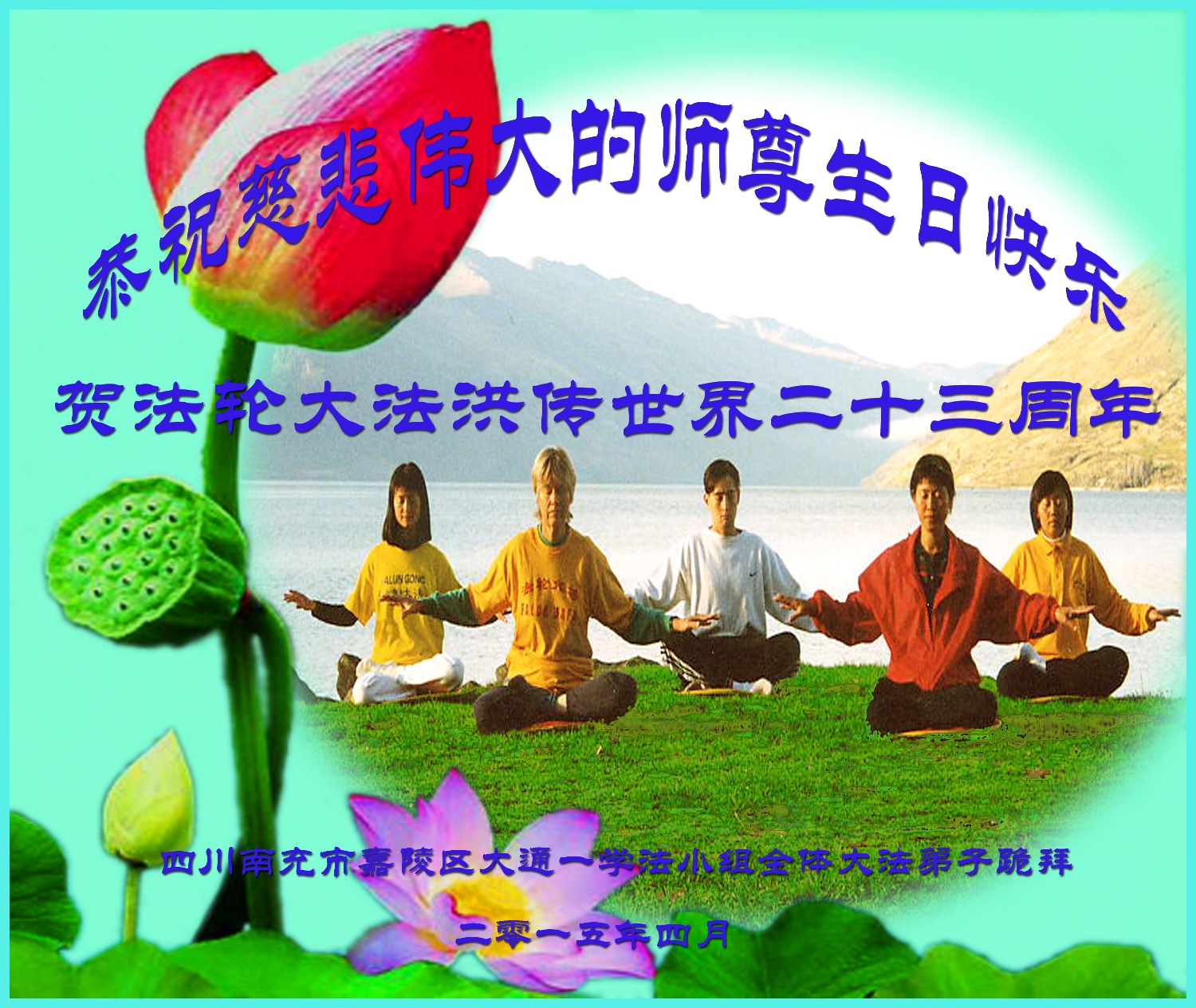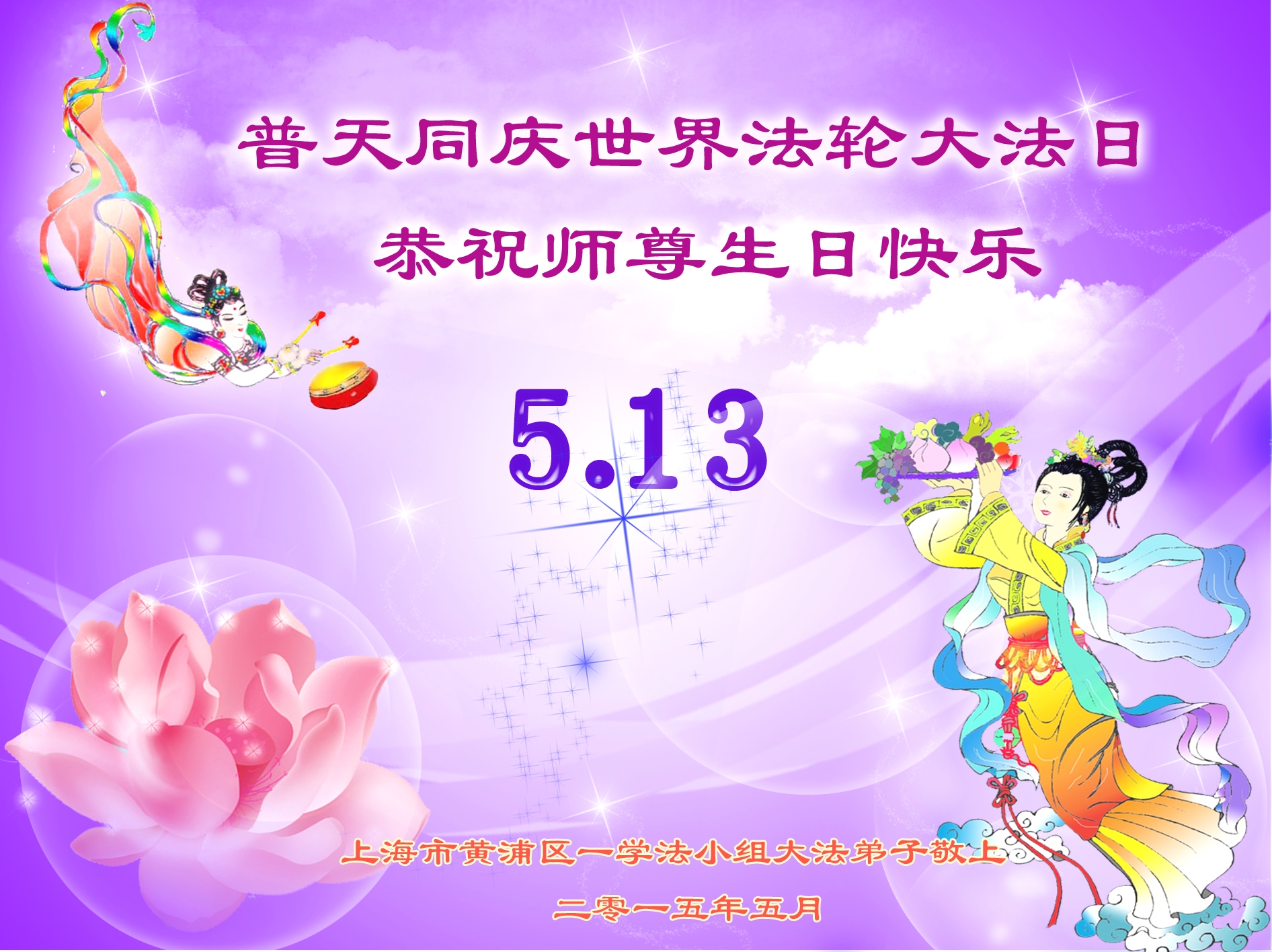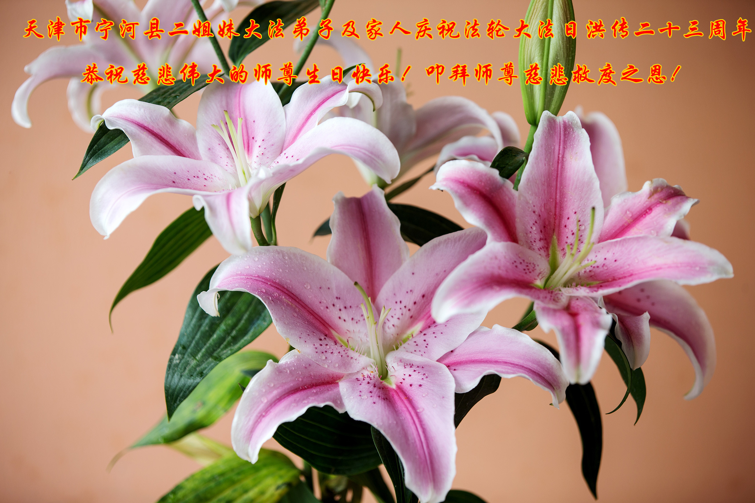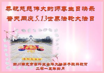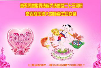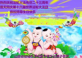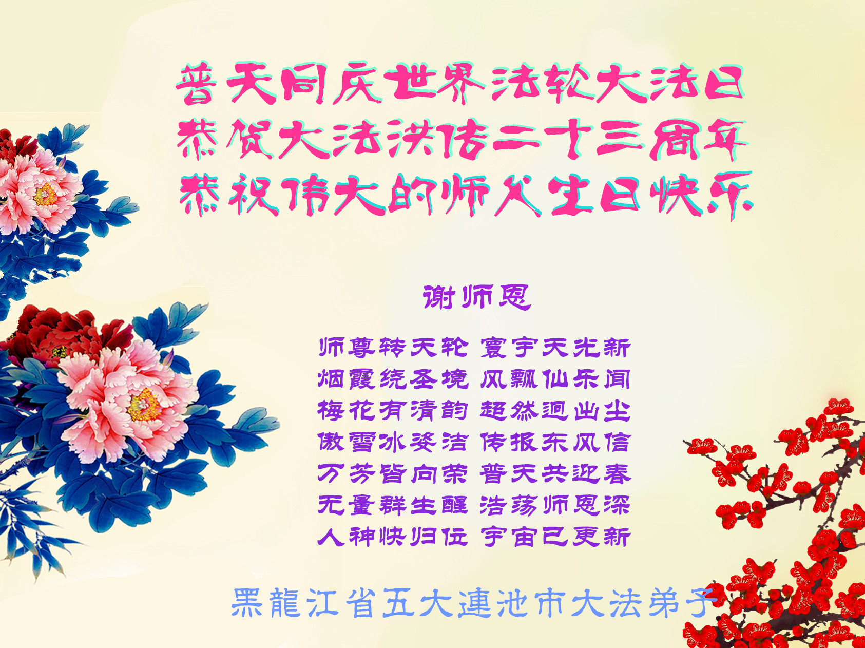 弟子们无法用语言、无限感恩师尊的慈悲苦度!叩祝慈悲伟大的师尊生日快乐!并与世界各地各位大法弟子及明真相的世人普天同庆法轮大法洪传二十三周年暨欢庆第十六届世界法轮大法日!