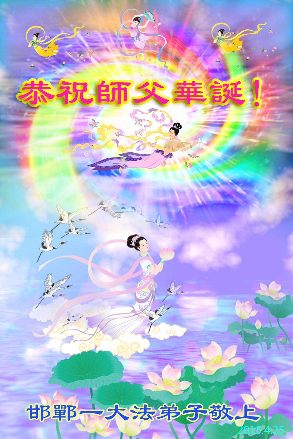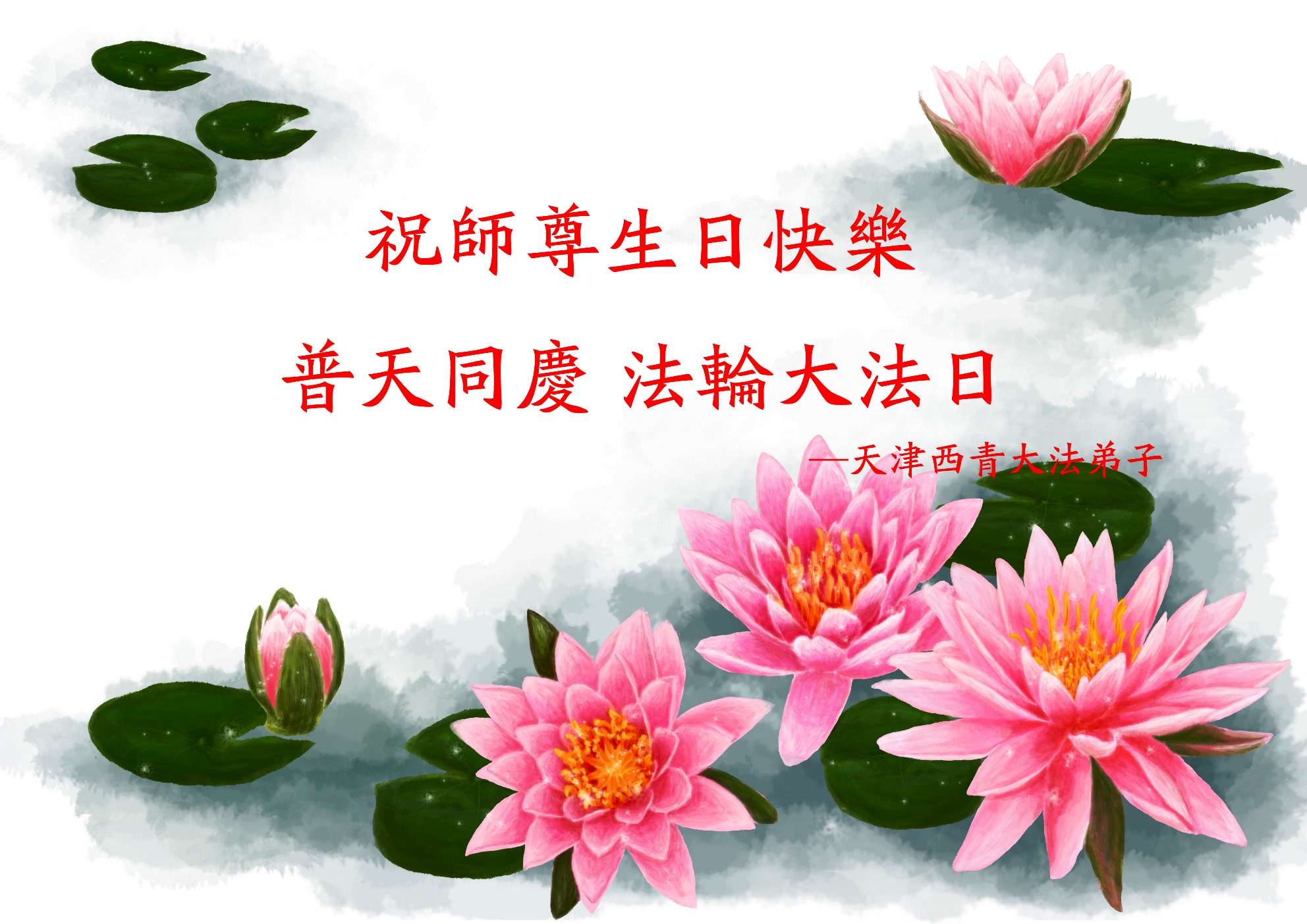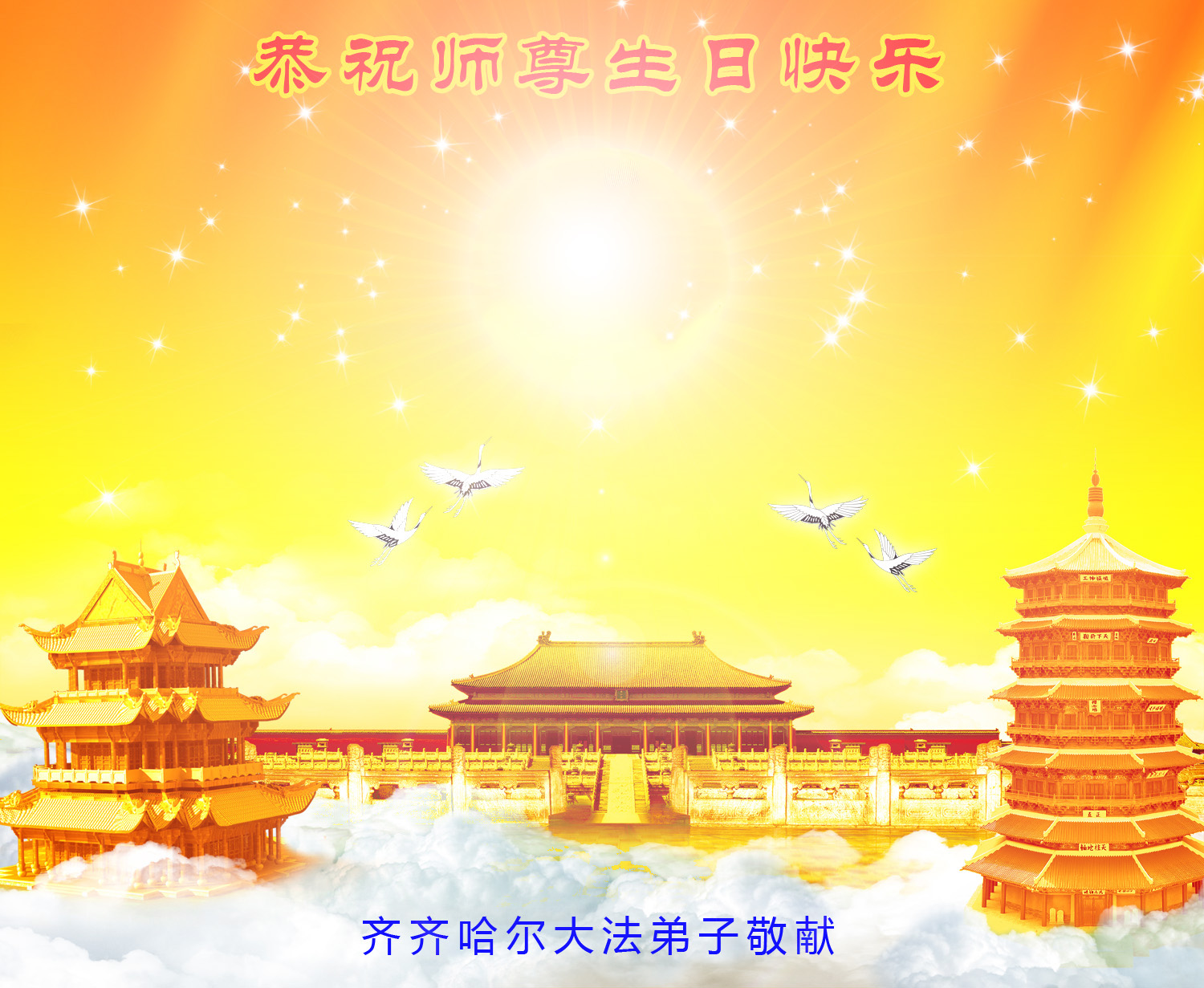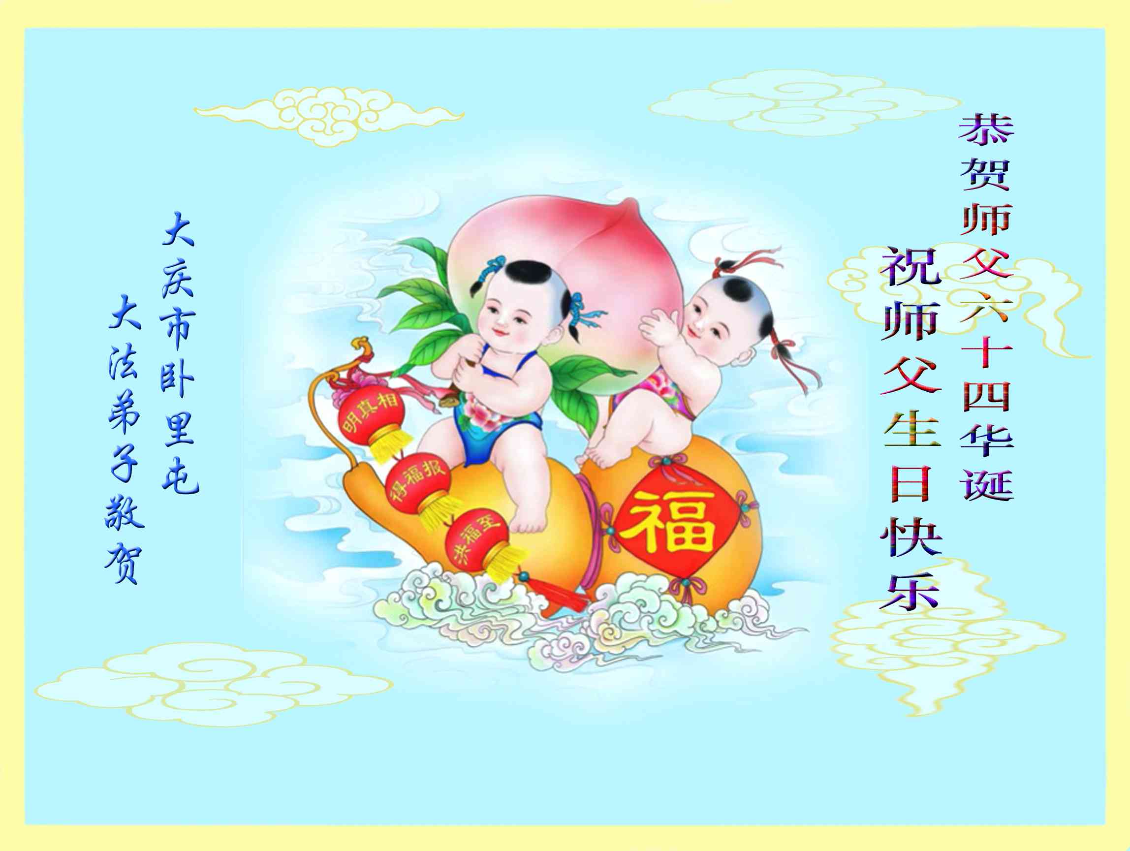 弟子们无法用语言、无限感恩师尊的慈悲苦度!叩祝慈悲伟大的师尊生日快乐!并与世界各地各位大法弟子及明真相的世人普天同庆法轮大法洪传二十三周年暨欢庆第十六届世界法轮大法日!