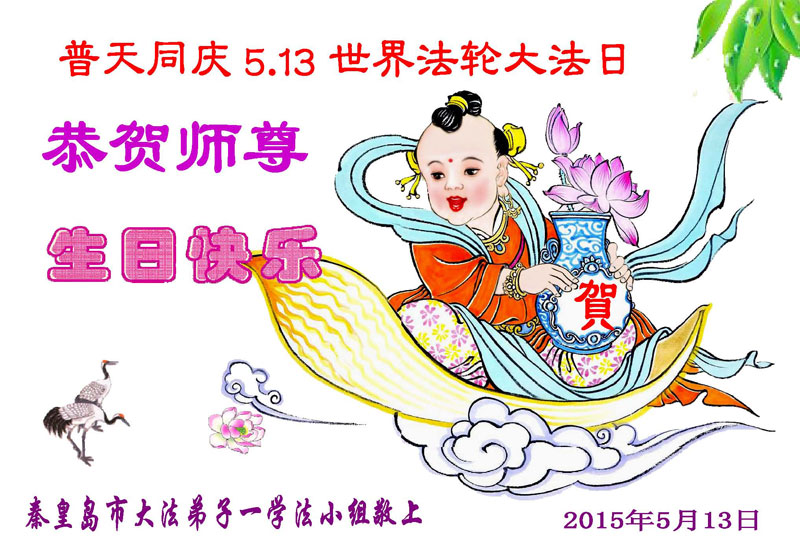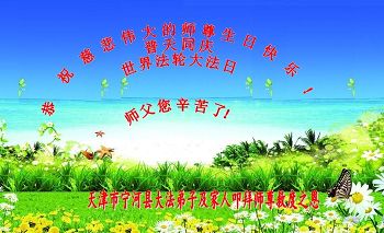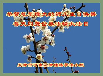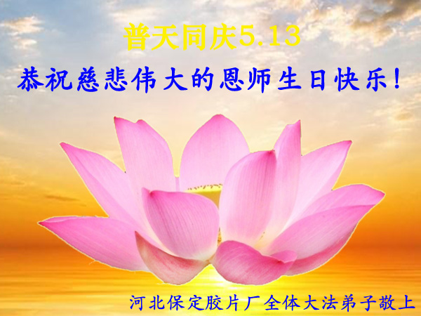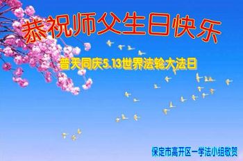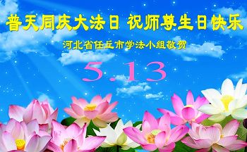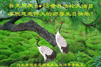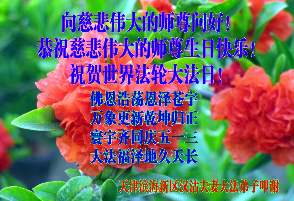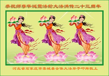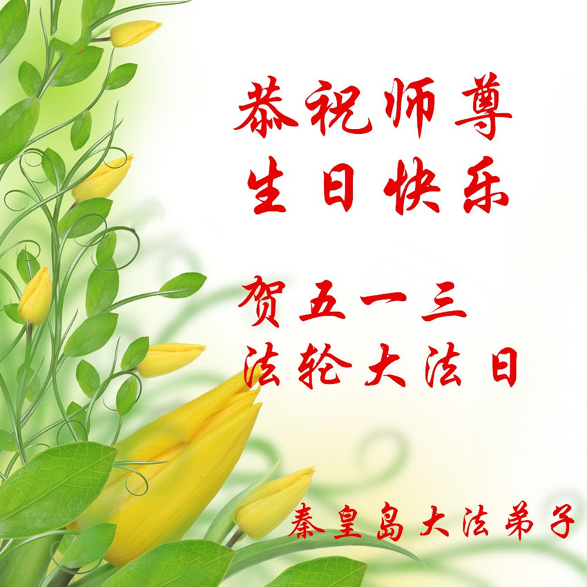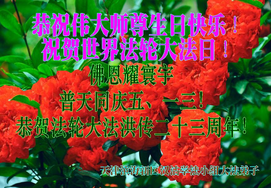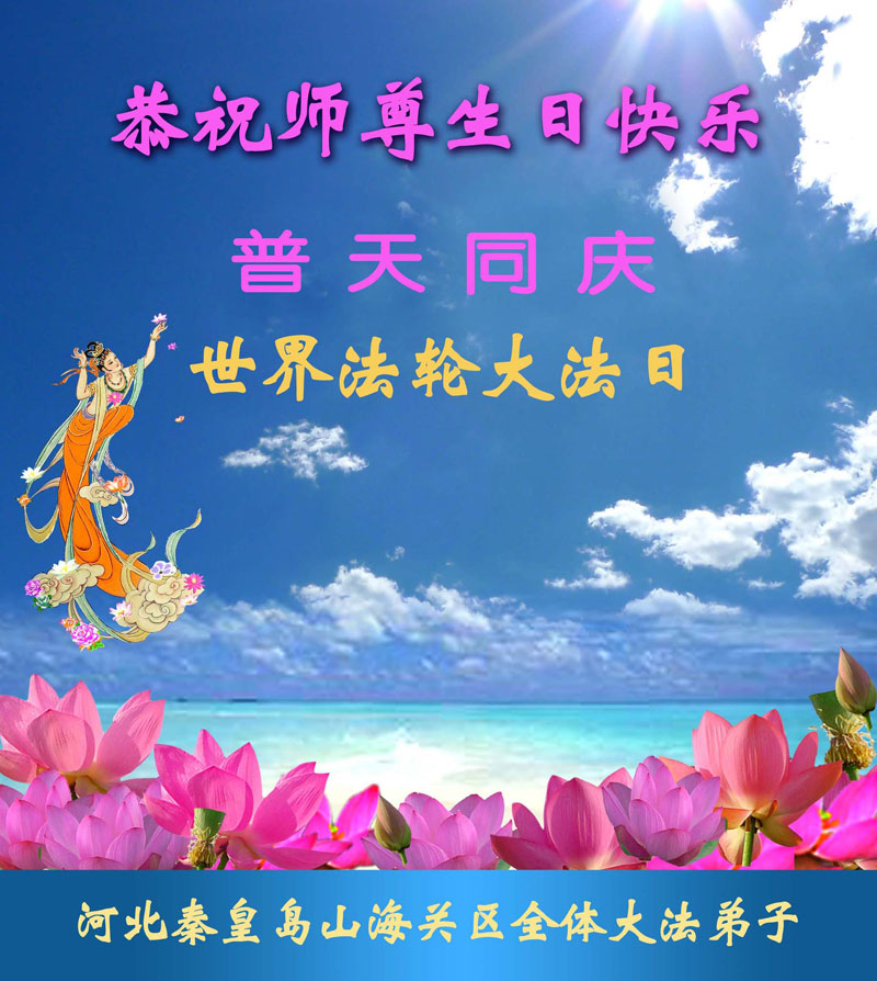 我们曹妃甸区全体大法弟子及明真相的乡亲非常感激您的救度之恩!法轮大法已经传遍我们这个沿海城镇,明白真相的人们口耳相传,奔走相告,真相资料已经家喻户晓,觉醒的世人正在以亲身的受益证实着法轮大法好!真善忍好!我们绝不辜负师尊的无量慈悲!我们无比的自豪,因为我们是主佛的弟子!在五•一三世界法轮大法日这个普天同庆的伟大日子里,我们和全世界的大法弟子一起恭祝慈悲伟大的师尊生日快乐!同时恭贺第十六个世界法轮大法日!我们会一如既往的做好师尊要求的三件事,履行好助师正法的神圣使命!曹妃甸区大法弟子敬祝!