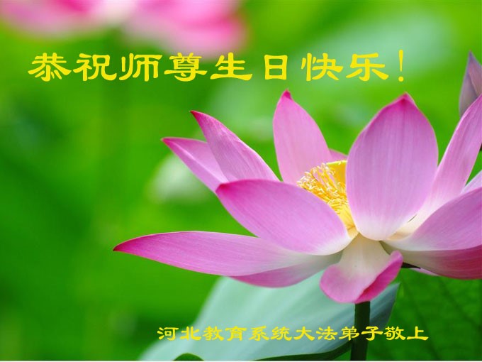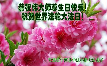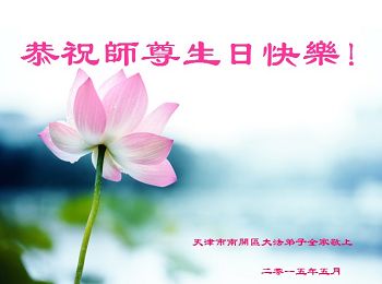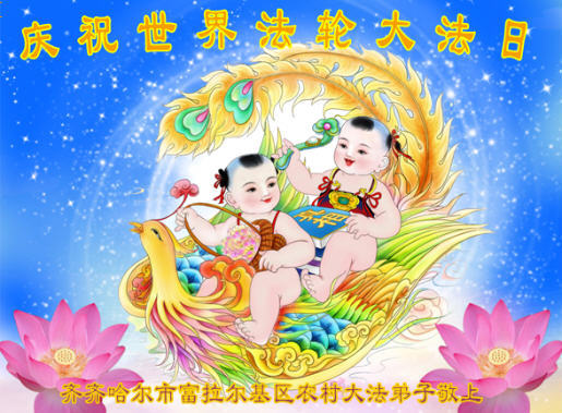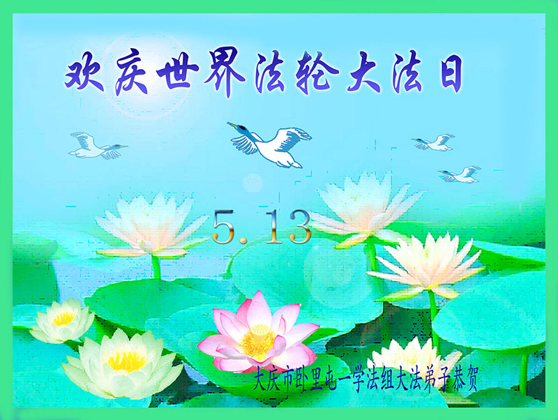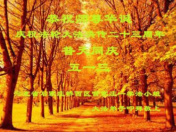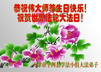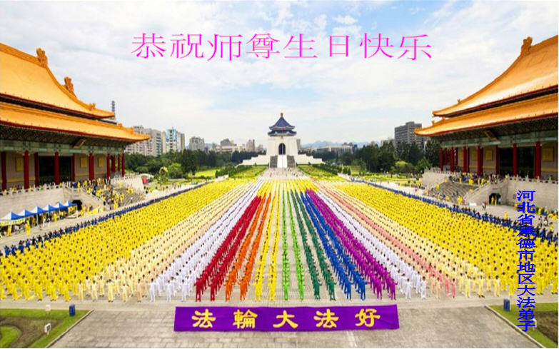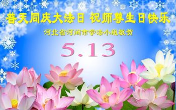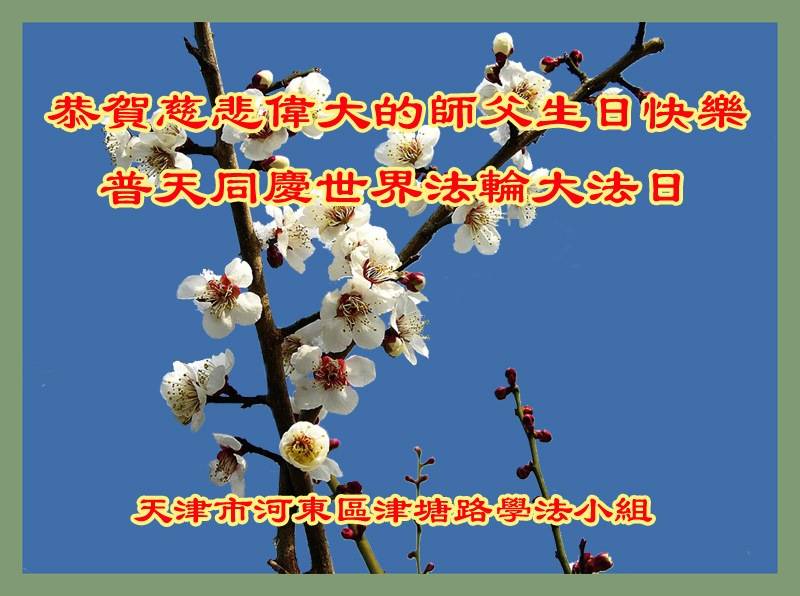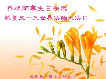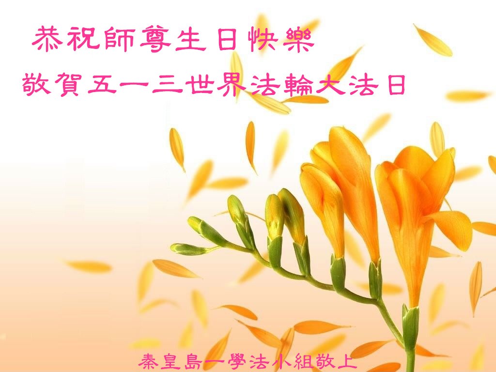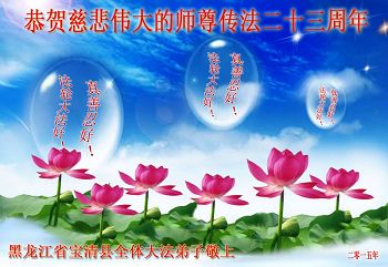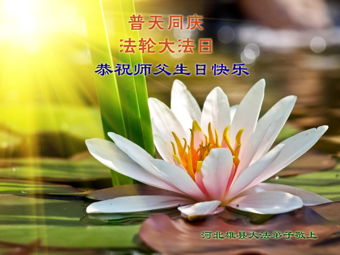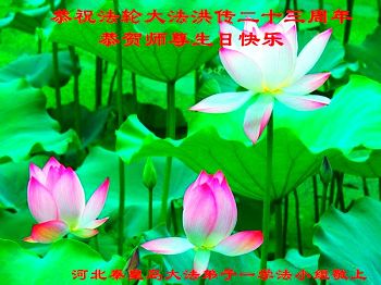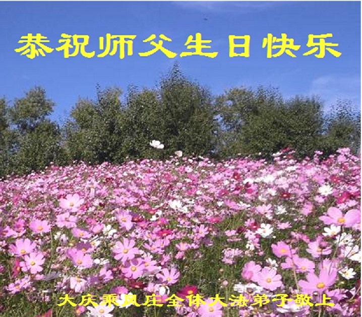 我们曹妃甸区全体大法弟子及明真相的乡亲非常感激您的救度之恩!法轮大法已经传遍我们这个沿海城镇,明白真相的人们口耳相传,奔走相告,真相资料已经家喻户晓,觉醒的世人正在以亲身的受益证实着法轮大法好!真善忍好!我们绝不辜负师尊的无量慈悲!我们无比的自豪,因为我们是主佛的弟子!在五•一三世界法轮大法日这个普天同庆的伟大日子里,我们和全世界的大法弟子一起恭祝慈悲伟大的师尊生日快乐!同时恭贺第十六个世界法轮大法日!我们会一如既往的做好师尊要求的三件事,履行好助师正法的神圣使命!曹妃甸区大法弟子敬祝!