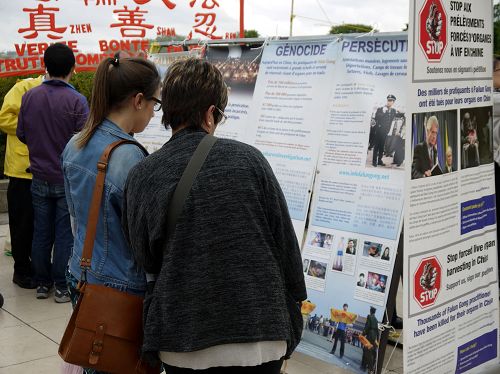 ![]() 民众和游客观看展板,和法轮功学员交谈并了解真相 |
