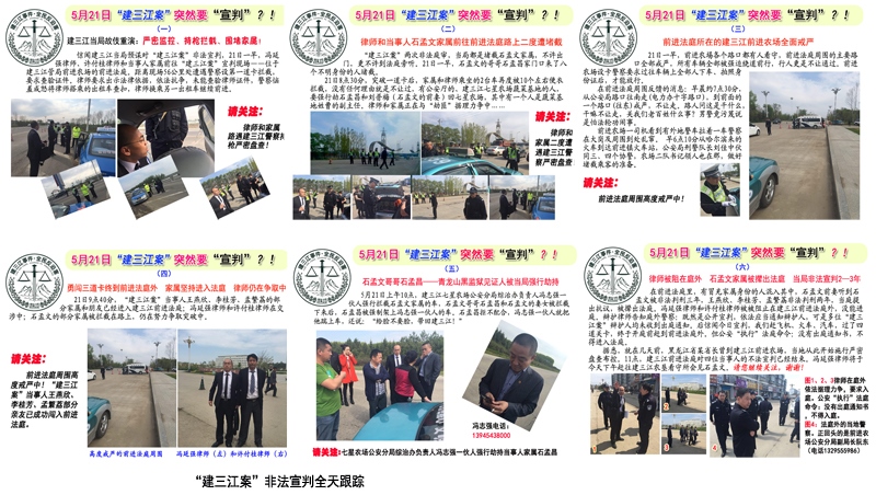 建三江当局定于五月二十一日非法宣判,代案律师和当事人亲友此前均未接到任何通知。惊闻此消息后,多位案件代理律师根本无法抽身,只有冯延强律师和许付桂律师连夜赶到佳木斯。二十一日凌晨,两位律师与当事人亲友会合,顾不得吃饭和休息,在一个旅店匆匆忙忙换上西装、打好领带,赶往建三江准备出庭。