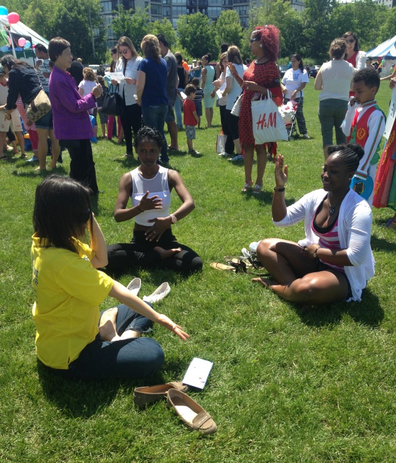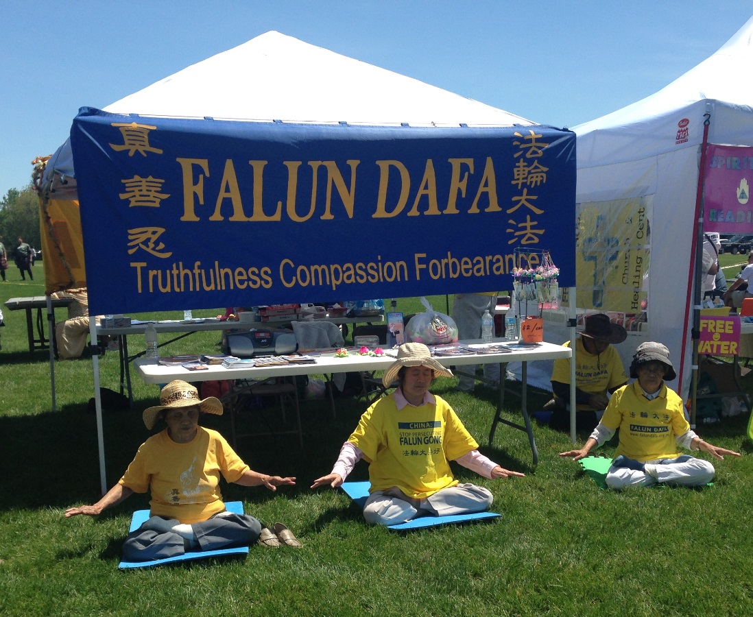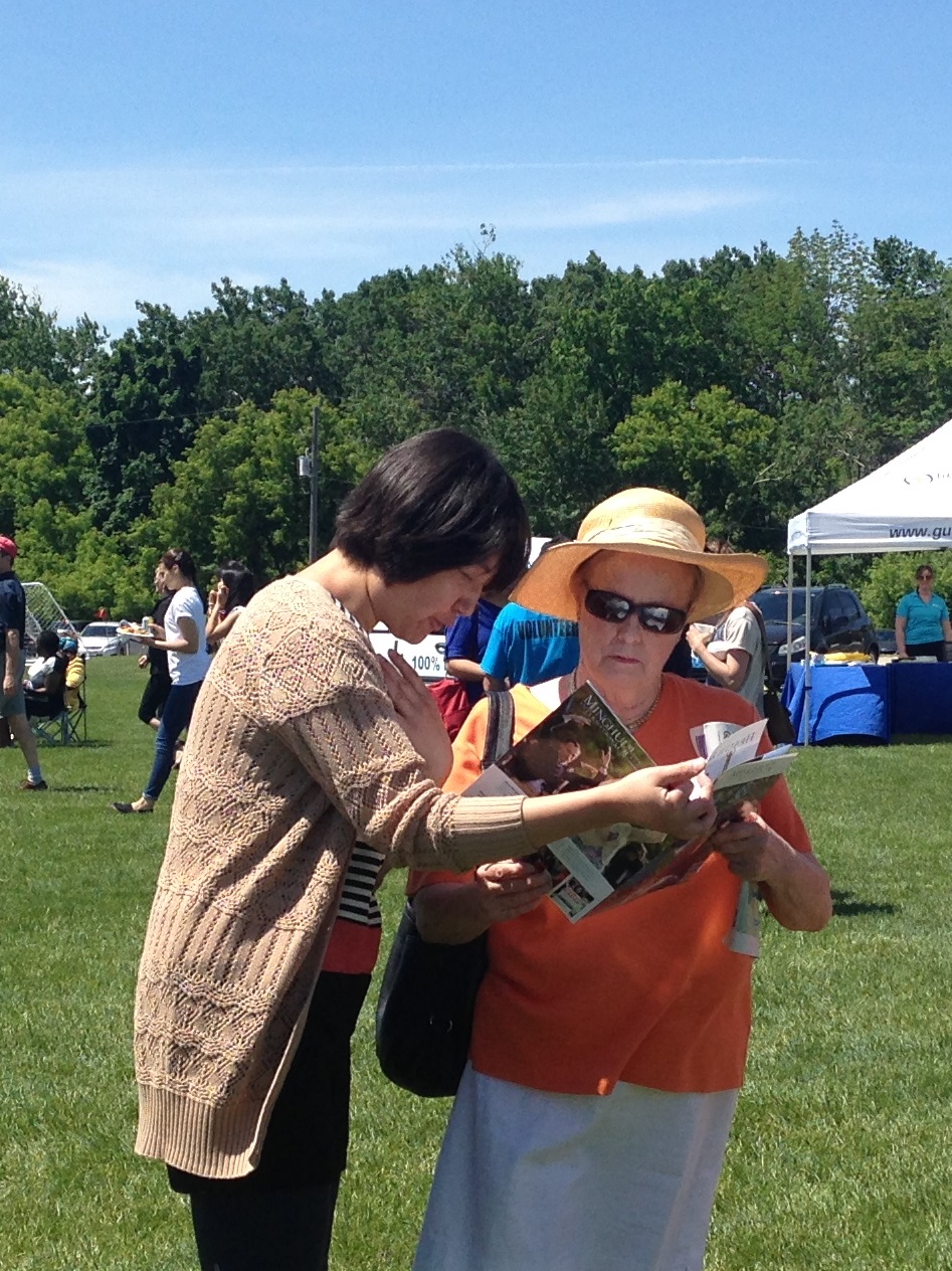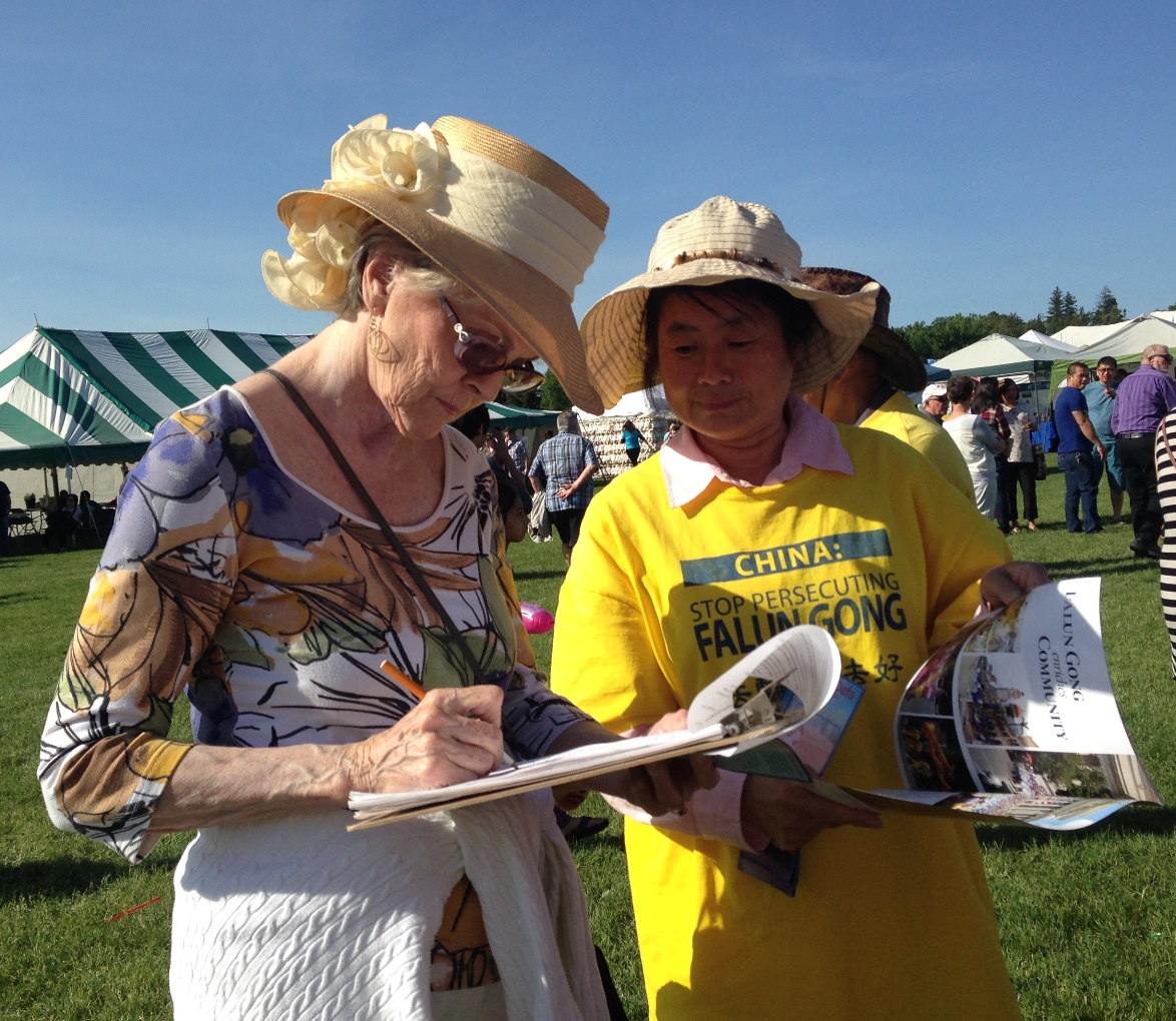 主办单位的义工中的两位华人女学生微笑着站在展位前观看法轮功学员的功法演示。她们都是在大陆出生,跟随父母移民加拿大,在贵湖市长大的孩子,性格都很纯朴。她们说,以前从中文媒体和父母那里了解到的法轮大法都是负面的信息。今天她们也想有机会全面的了解一下。她们觉的法轮功的功法和“真、善、忍”都很好。当得知法轮功学员在中国大陆受到迫害时,她们都很惊讶。她们拿了所有的中文真相资料要回去让家人看。两人都说暑假要读《·九·评*》,研究一下真实的中国近代历史。
