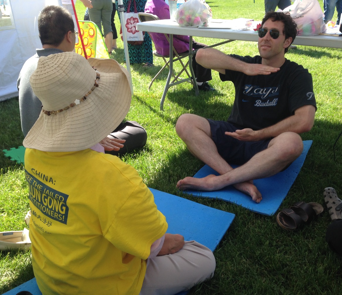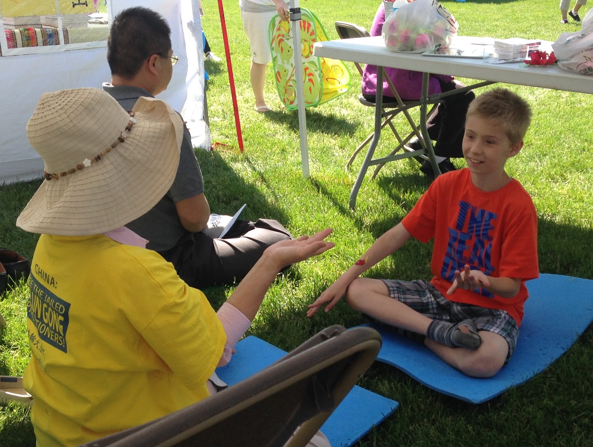 ![]() 法轮功学员正在跟前来参加文化节的民众讲述法轮功的真相。 |