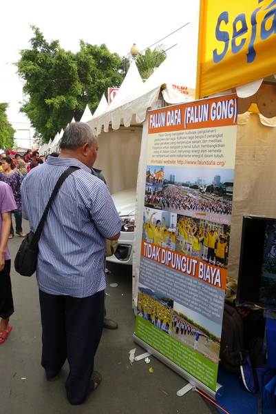 与喧闹的环境形成鲜明对比的是,法轮功(又称法轮大法)学员的展位就象一片宁静祥和的绿洲。从早晨到晚上,学员们轮流演示五套功法,散发传单,播放真相影片,给在场的数千观众提供了解法轮大法的机会。