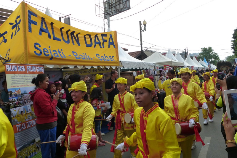 法轮功学员组成的腰鼓队也进行了表演,受到在场观众的热烈欢迎。