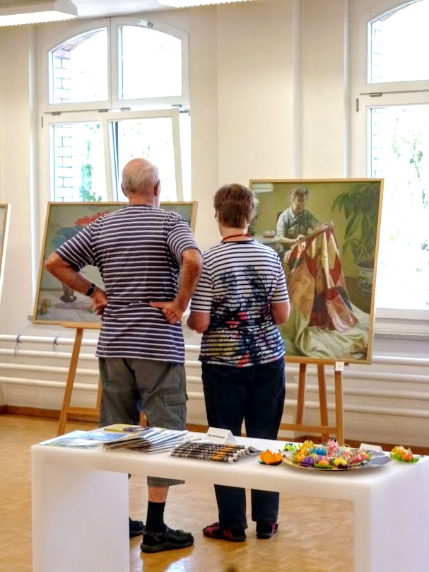 来自东欧的女士在看完画展后,和导览谈话时,忍不住就满眼盈泪,夺眶而出,止不住地流。她表示非常了解共产党的邪恶本质,但也完全没有想到中共竟然杀害了八千万中国人,而对法轮功的迫害也还在持续。和女士结伴而来的男士则是正气凛然地指出,共产党绝对不会永远存在,柏林墙的倒塌就是最好的见证。女士点头表示认同,但也忧心忡忡质疑中共对社会人伦造成的破坏需要多久才能复原,中国人民是否得经过一、两代的时间才会对说谎和贪污腐败引以为耻。女士除对画作赞赏外,她打内心深处赞佩画家们的苦心造诣,救灾拯溺的精神。