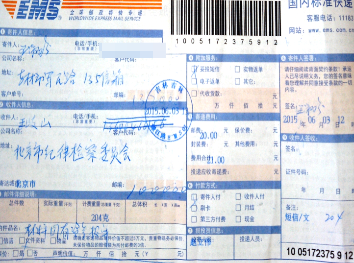 【明慧网二零一五年六月十三日】吉林市监狱警察王淑珍,已将对迫害元凶江泽民的刑事控告书邮寄给北京最高检察院、最高法院、国家领导习*近*平主席、王岐山等处。