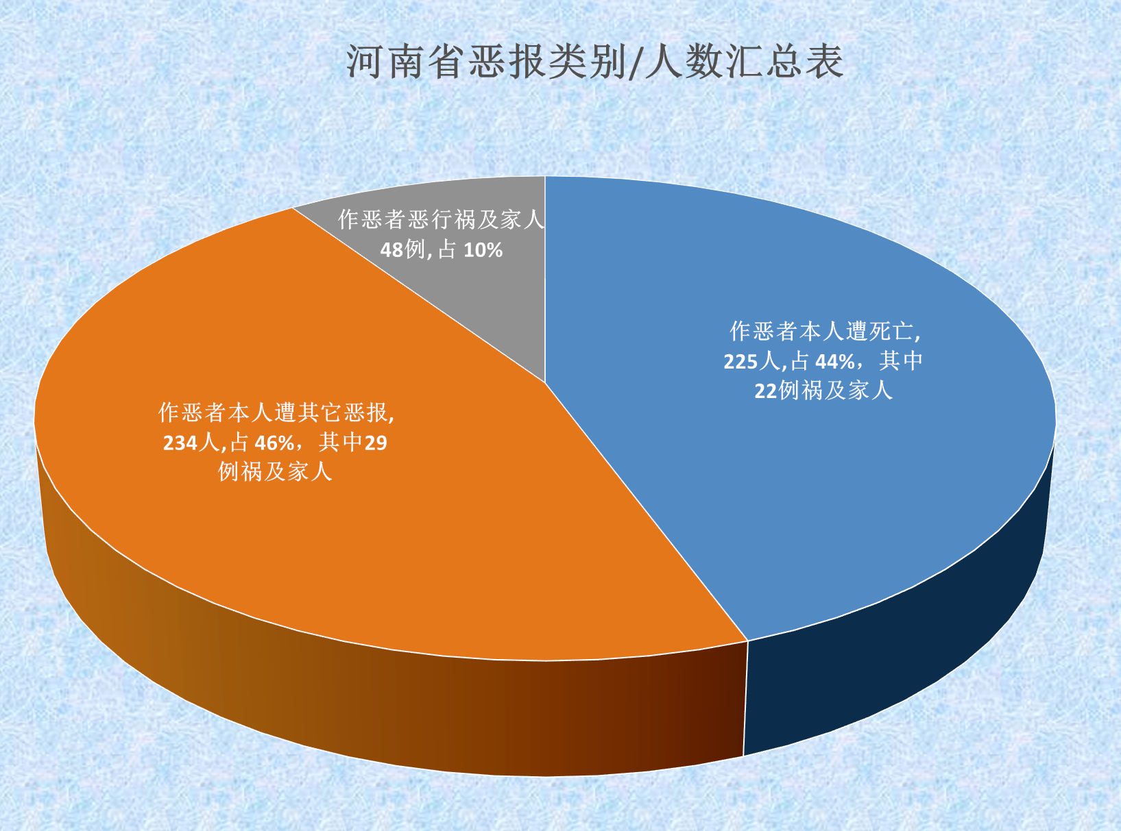 在225例死亡恶报中,政法、公检法司系统死亡人数91人,约占全部死亡人数的40%。在282例其它恶报人数中,政法、公检法司系统恶报人数145人,约占其它恶报人数的51%。在全部507例恶报人数中,政法、公检法司系统恶报236例,占总恶报人数的47%。
