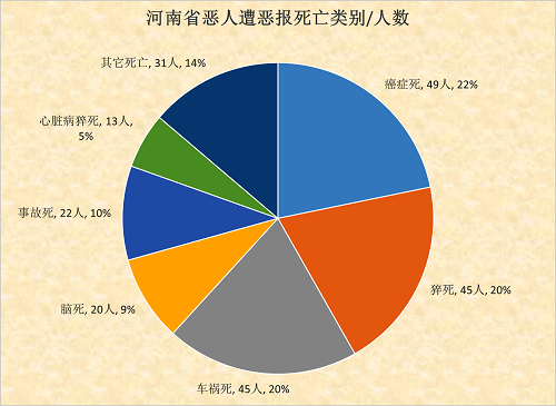1、河南省参与迫害法轮功者本人遭死亡恶报225人,具体死亡类别/人数如下表/图: