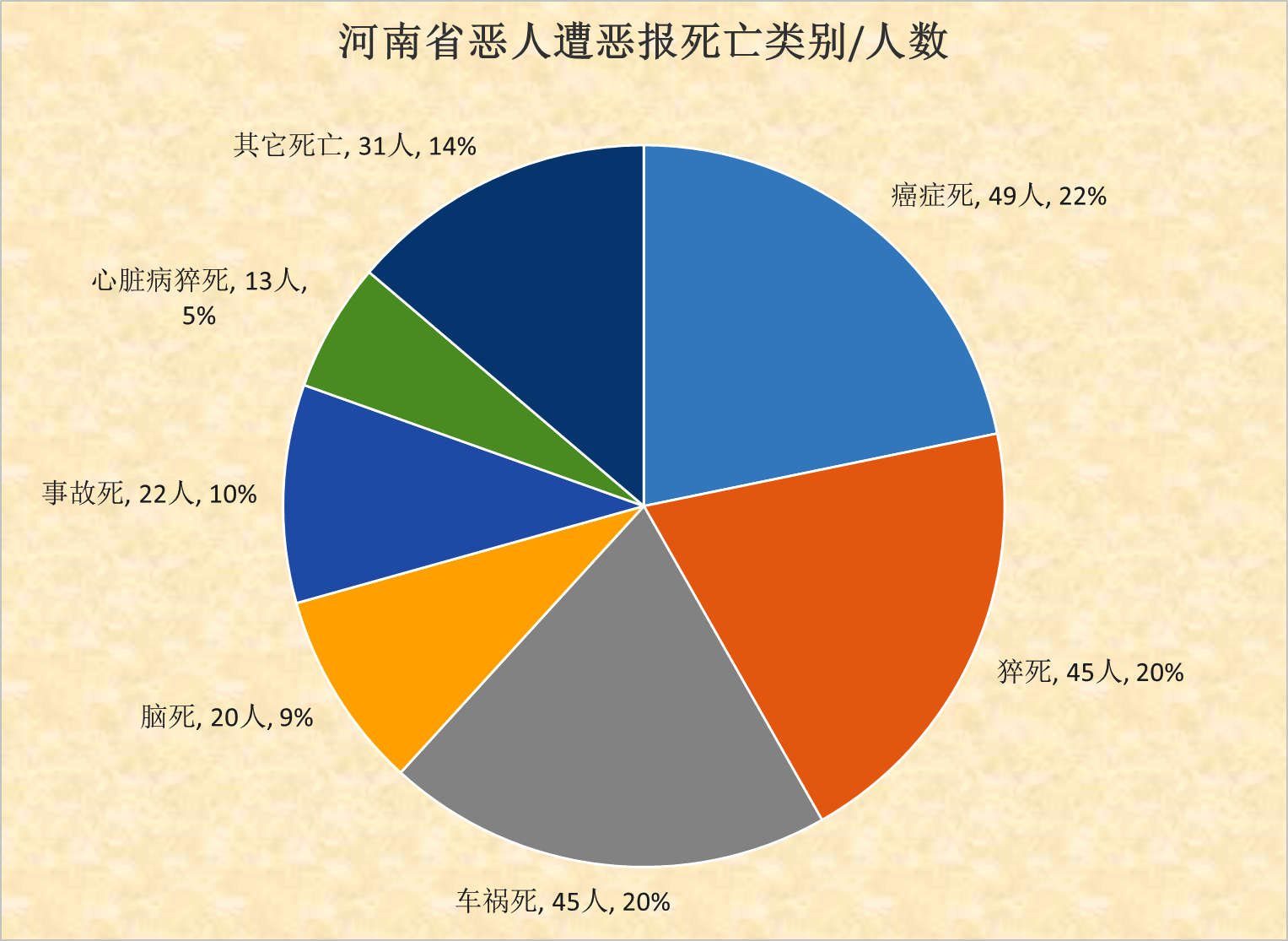 | 其它死亡 | 31 | 14% | 肾衰死、贫困死、怪病死、其它恶报死 |