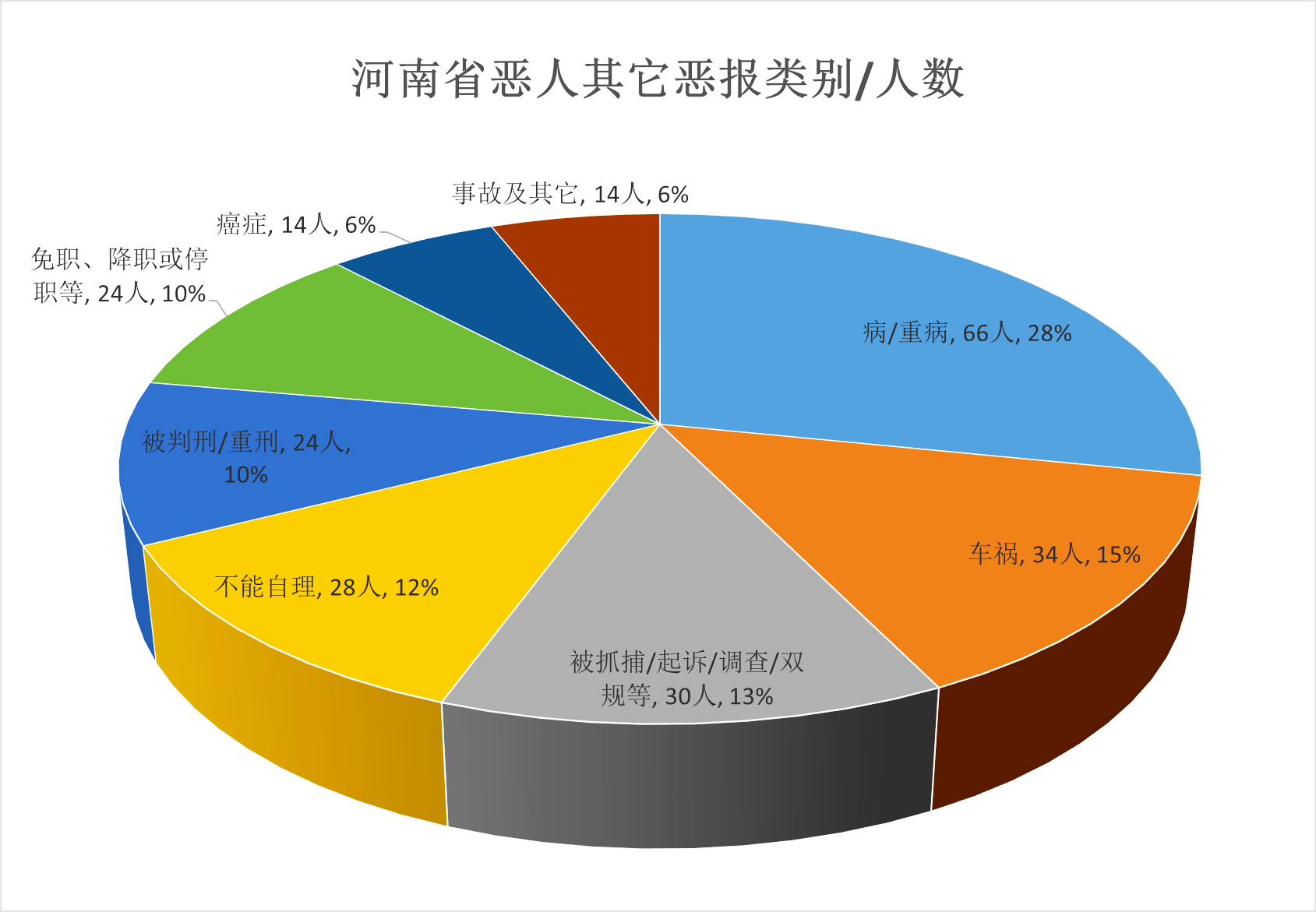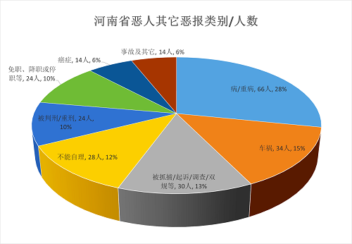 2、河南省参与迫害法轮功者本人遭其它恶报234人(不包含单独祸及亲人案例),恶报种类及人数如下表/图: