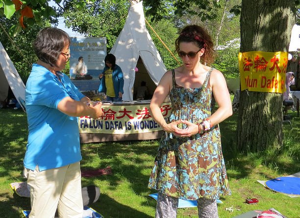 来自于Indie88电台的Rochelle Douris女士被法轮大法展位前面优美舒缓的功法演示所吸引,听完介绍,她现场学起了功法,第一套功法只学炼了一分钟,Rochelle就高兴地说觉得浑身非常热,热得舒服,感觉非常好。她说:“这个功法太好了!”她和摄影师一起采访了法轮功学员,并表示要把这个有关法轮功的视频节目放在电台和网上视频直播。